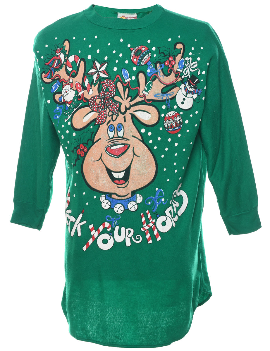 Green reindeer design sweatshirt complete with a drop shoulder.