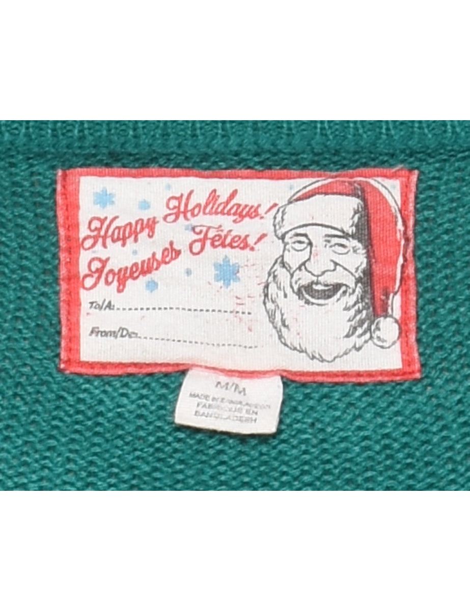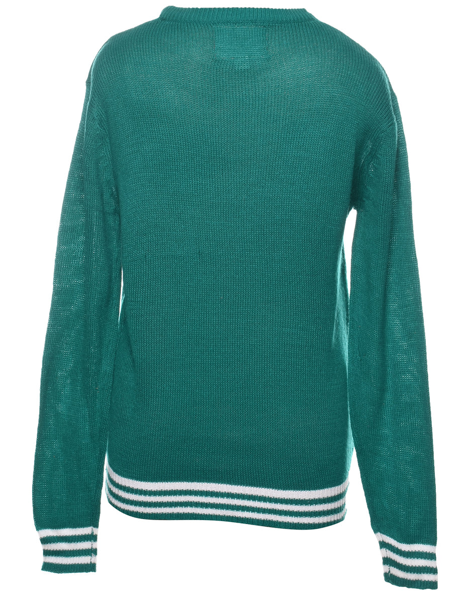 Reindeer green christmas jumper with a ribbed neck and cuffs.