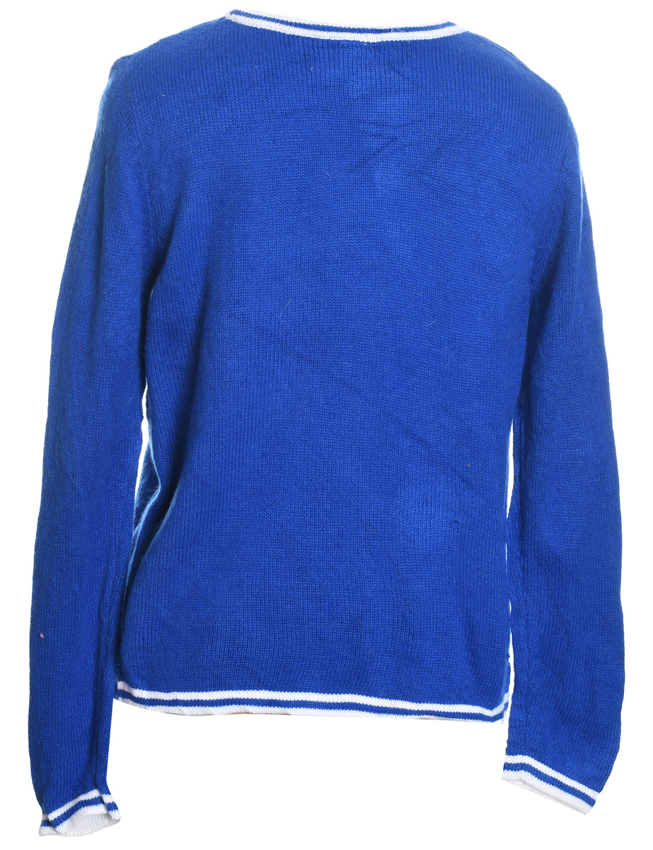 Santa Claus design blue knit Christmas jumper complete with an applique design and beading.