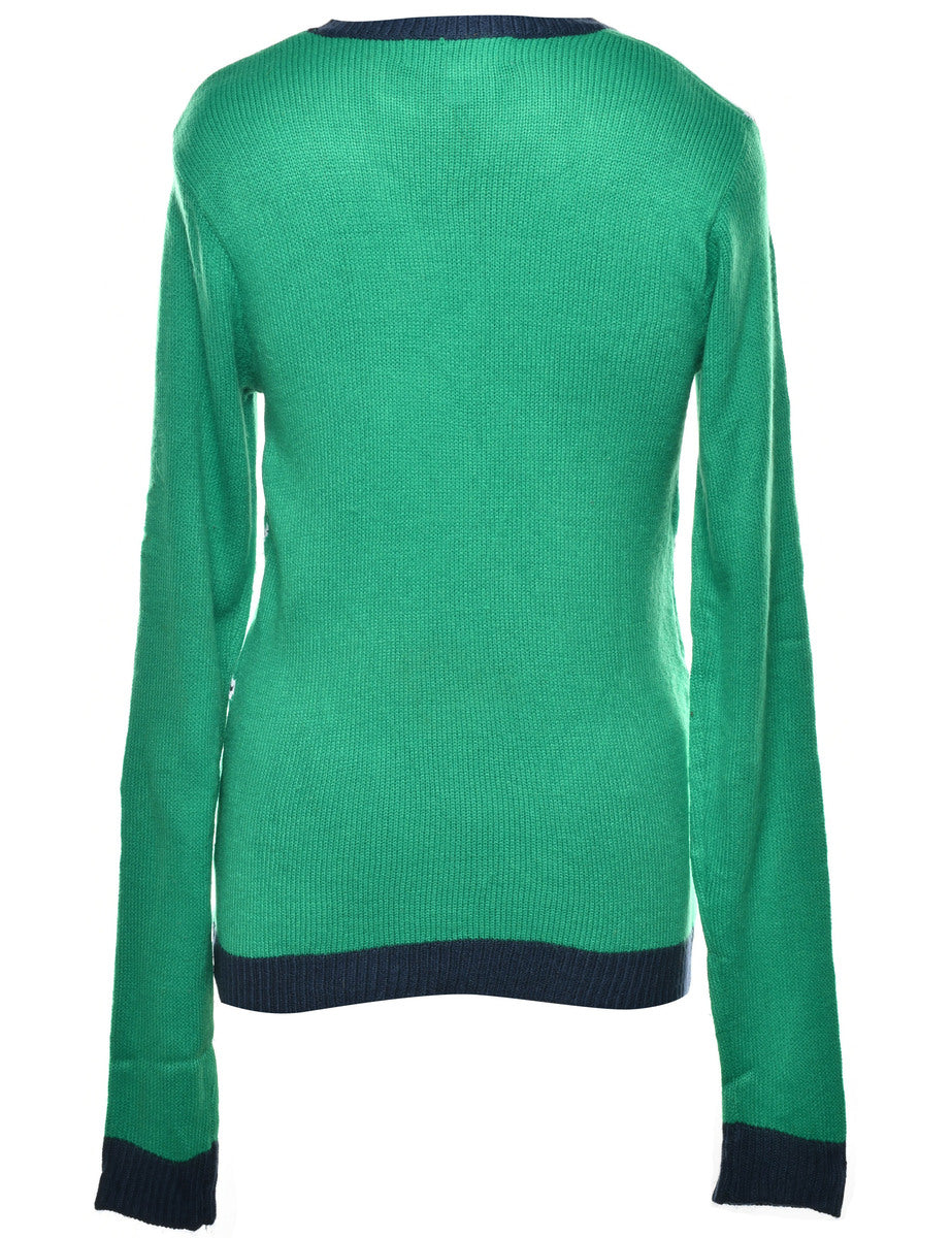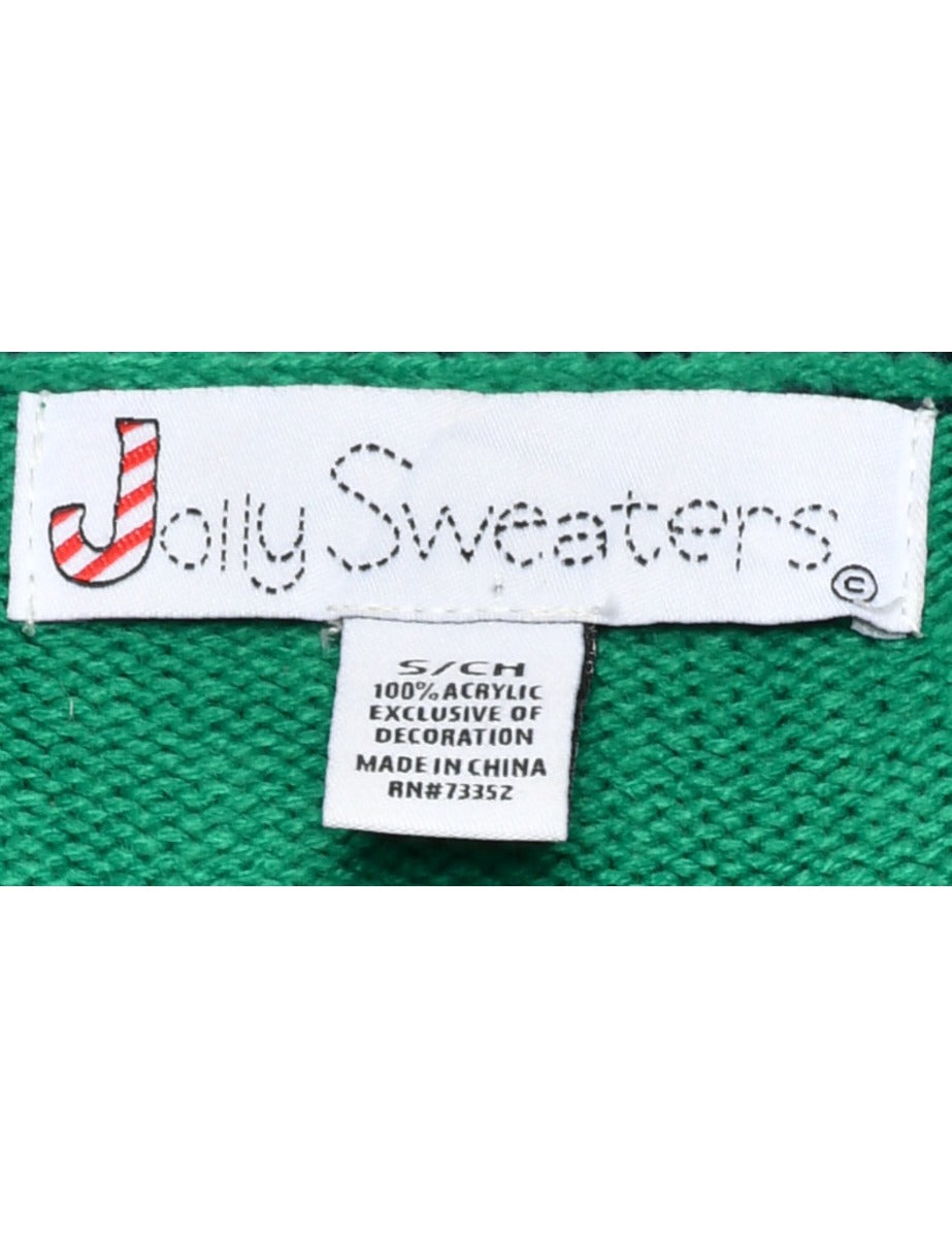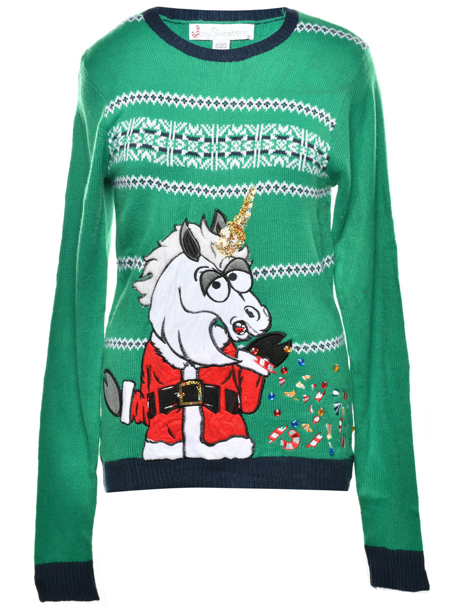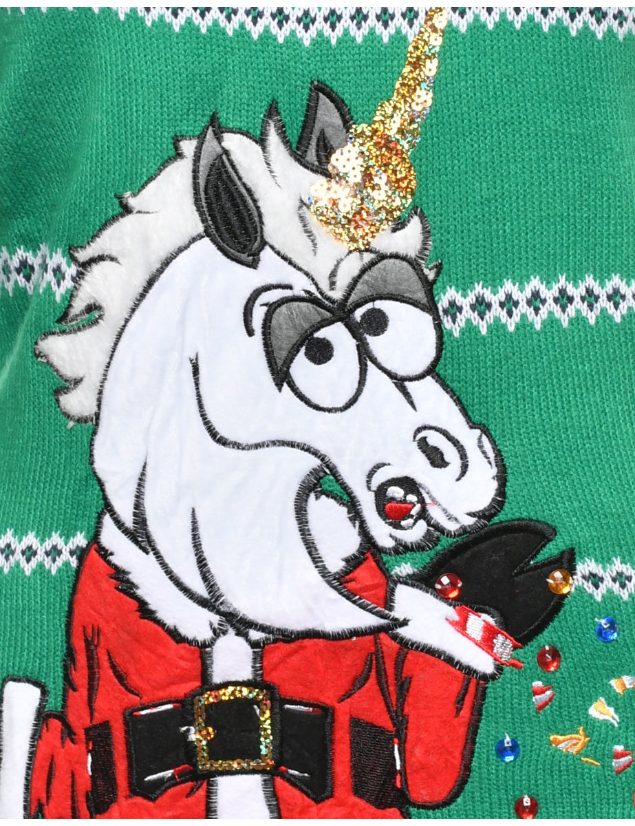 Festive season christmas jumper with santa claus design. Comes in green with patchwork applique and sequins.