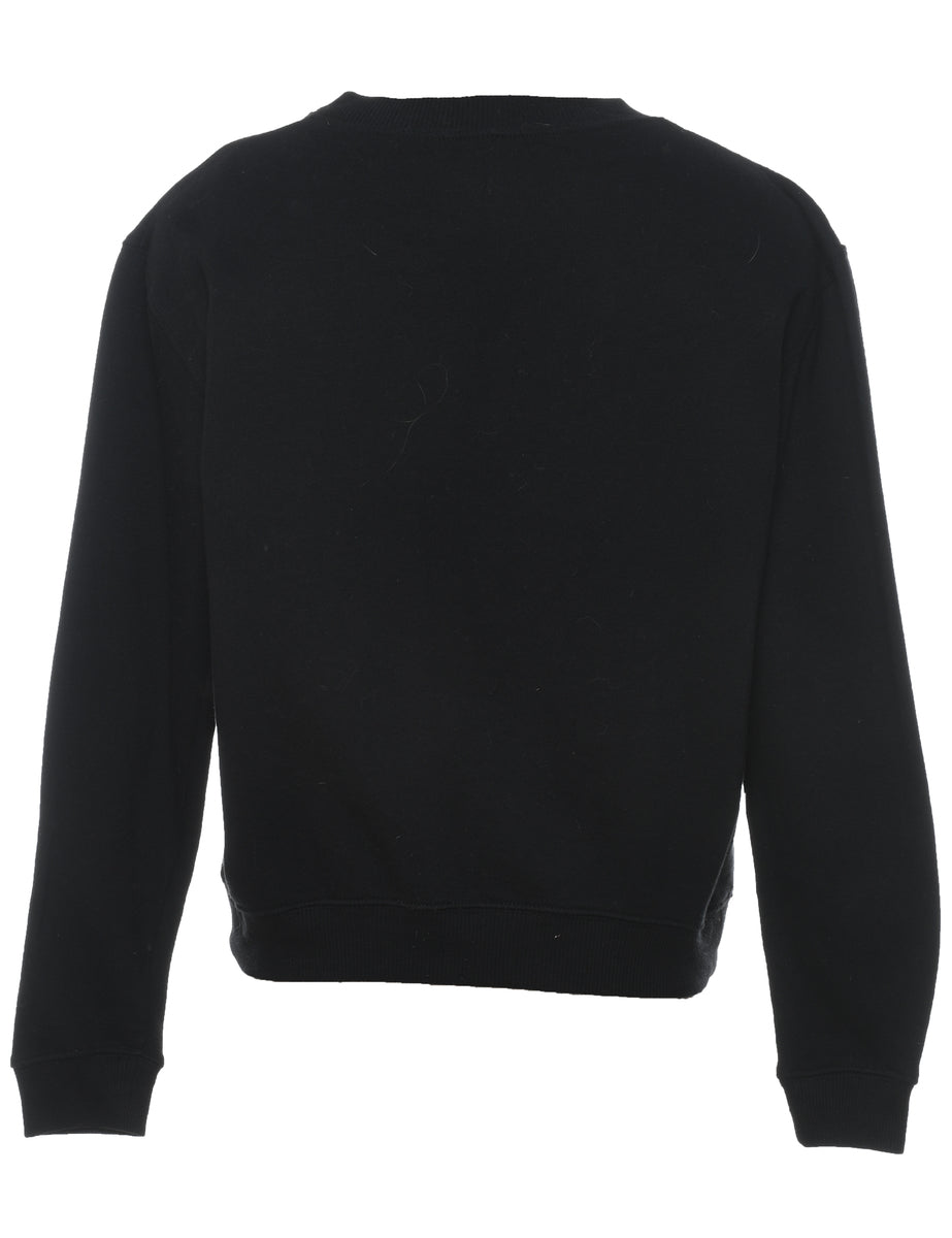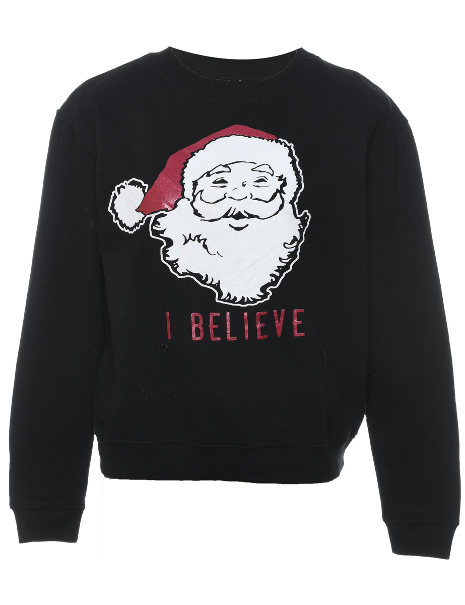 Santa claus christmas sweatshirt comes in black with a ribbed neck.