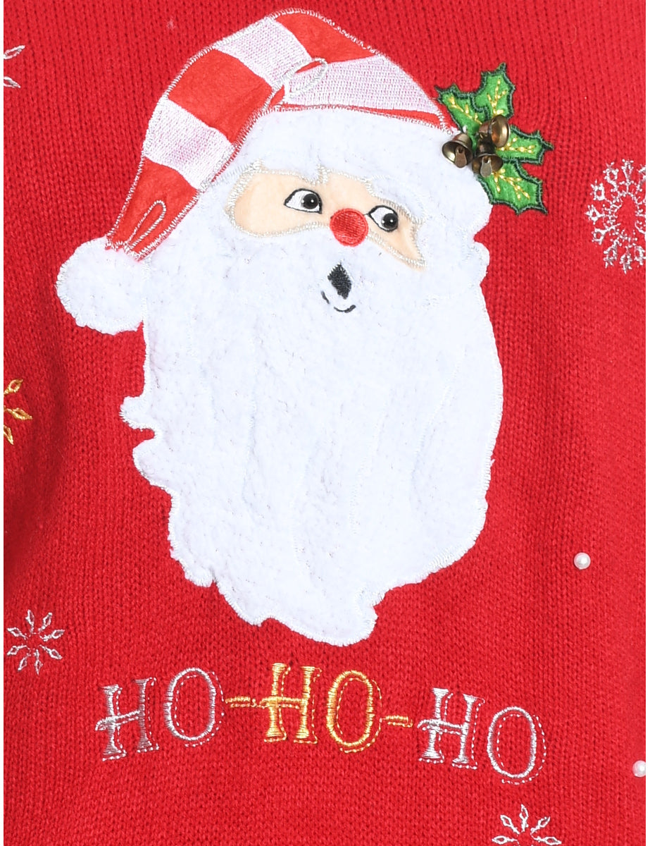Santa Claus design red embroidered jumper complete with an applique design and small bells attached.