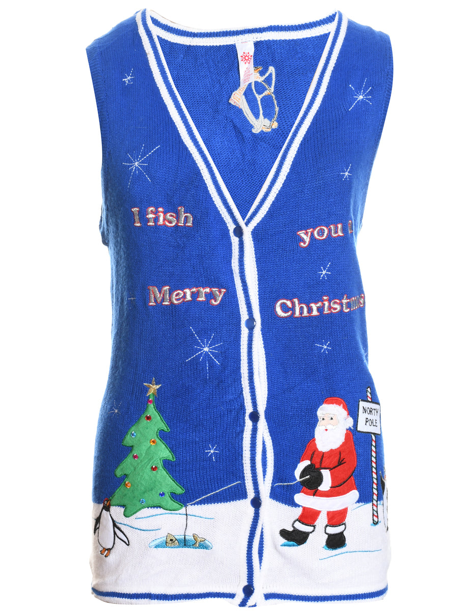 Blue knit Santa Claus knit vest complete with a v-neck and an applique design.