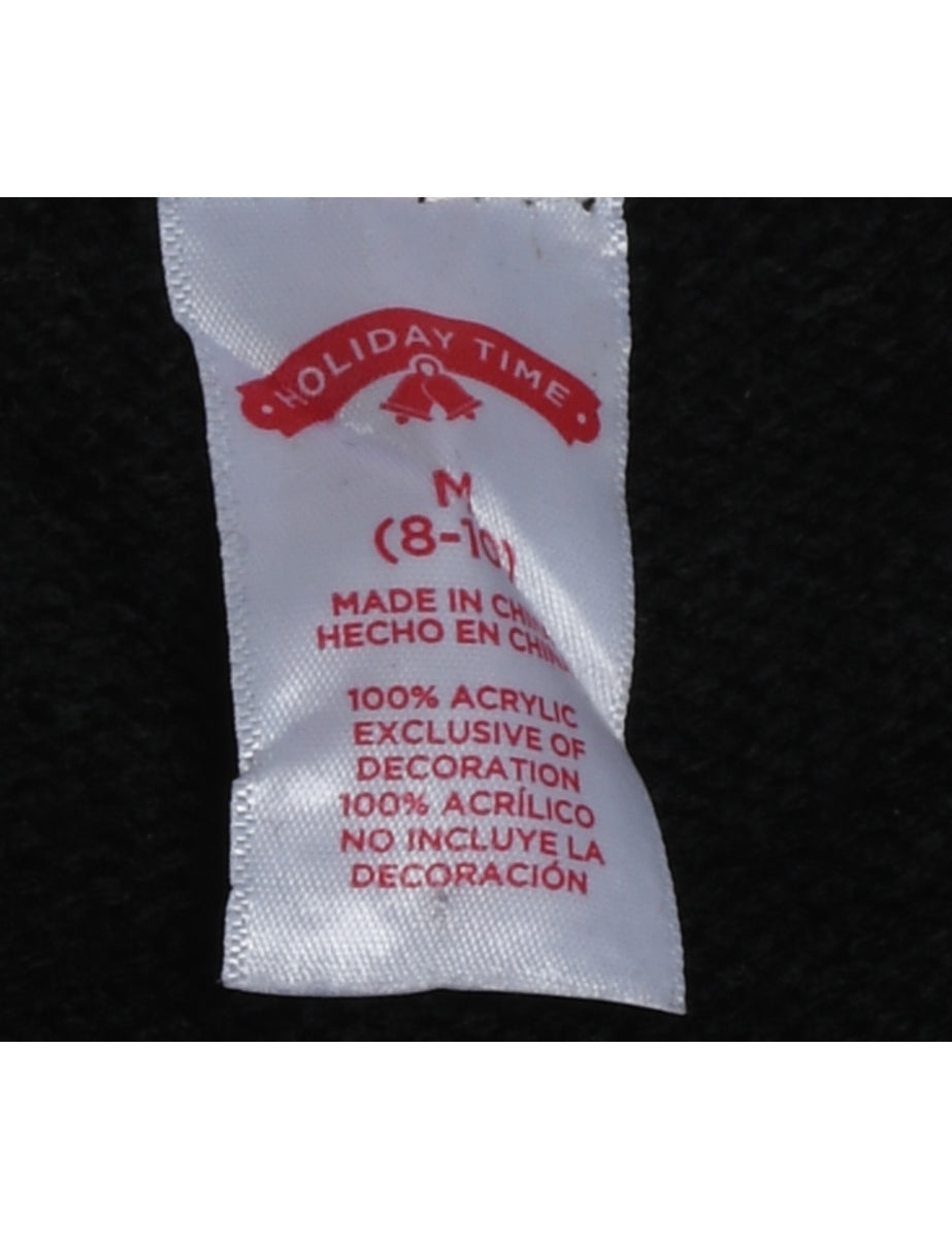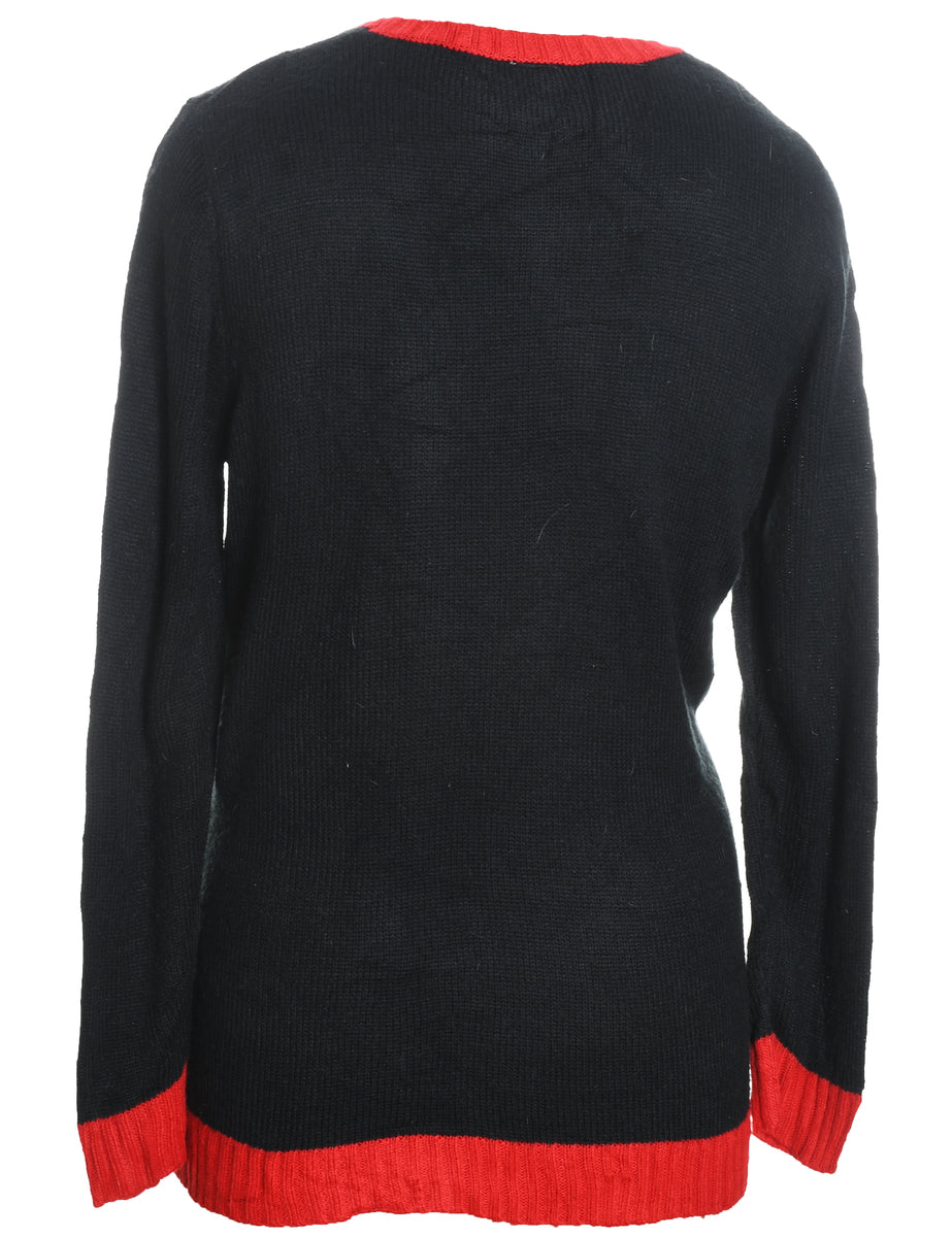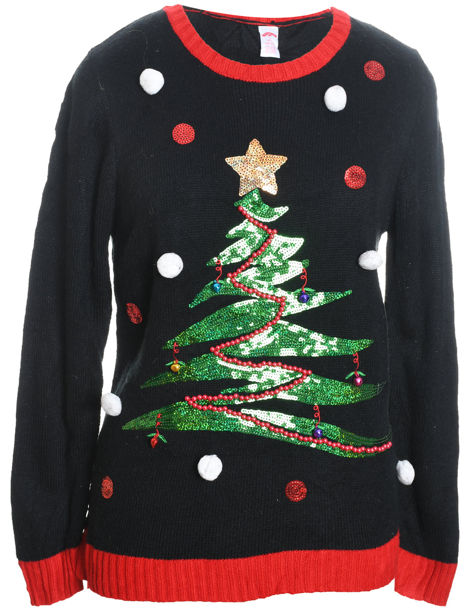 Festive print jumper in black with christmas tree design, pom poms and small bells attached.