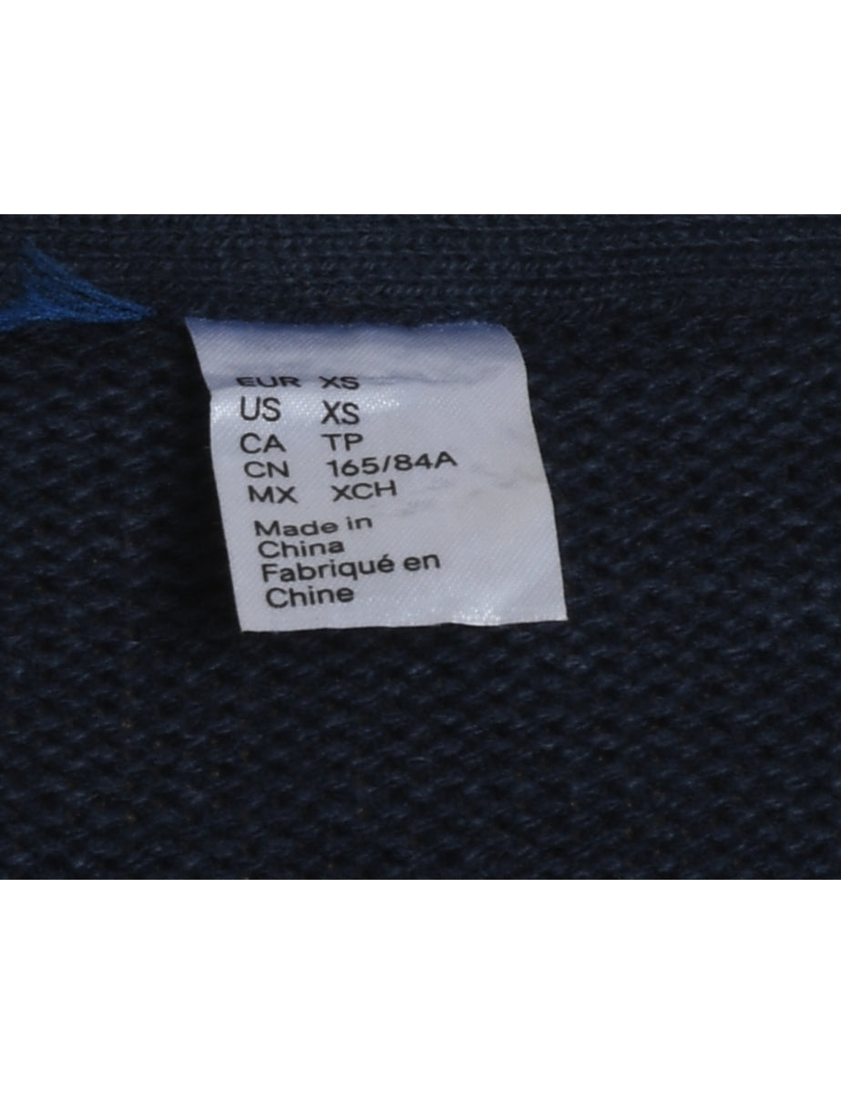 Festive season navy jumper with christmas tree design, pom poms and small bells attached.