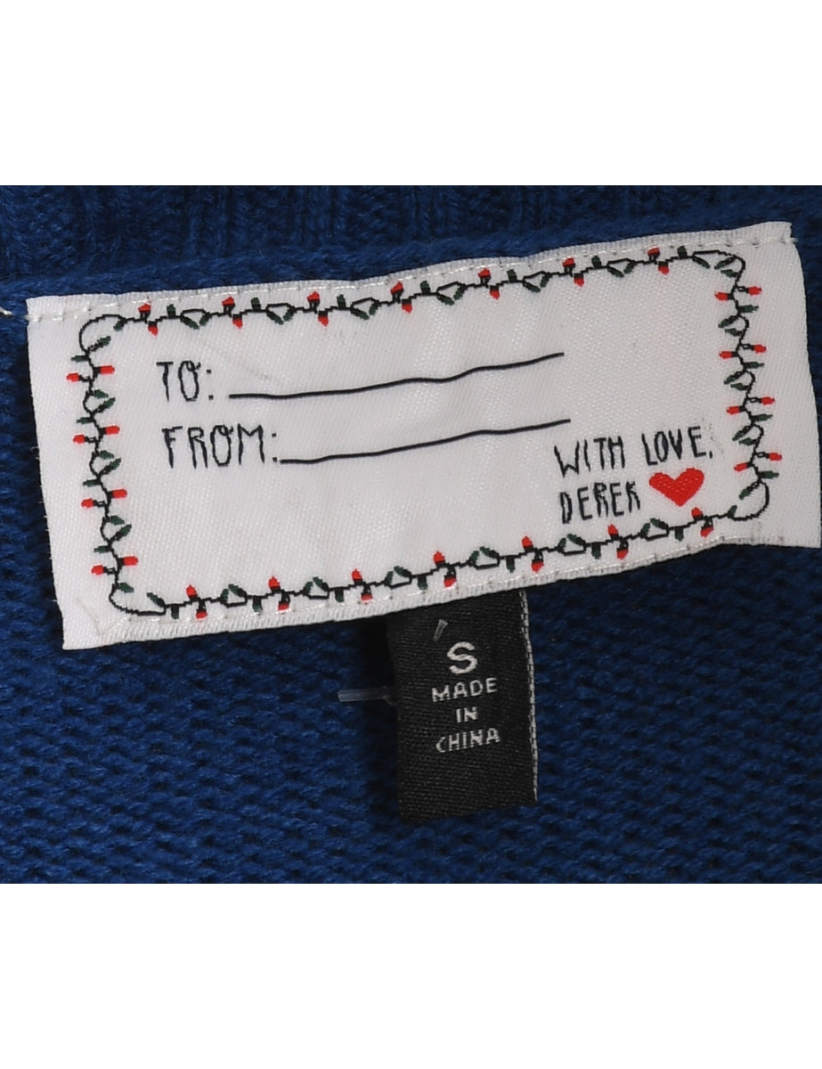 Festive print christmas jumper in blue with a drop shoulder and sequins.