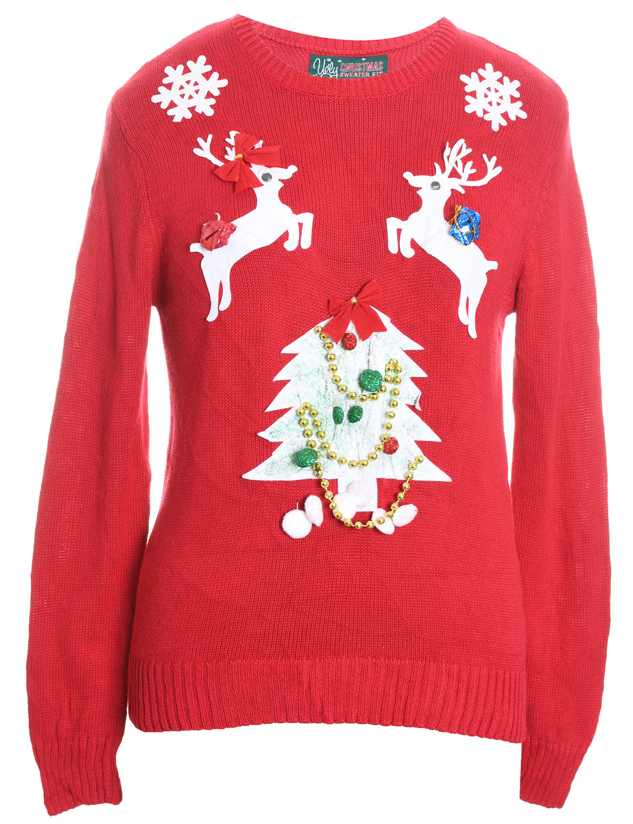 Festive season red tree design Christmas jumper complete with an applique design and beading.