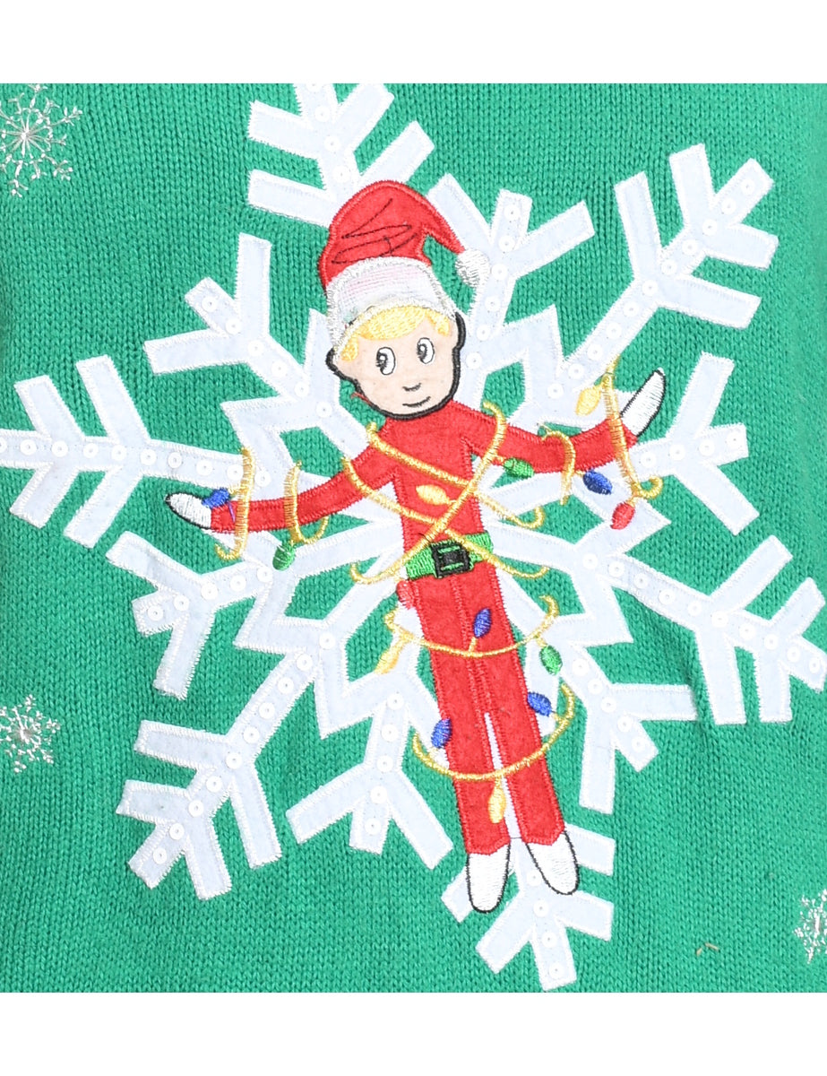 Green knit Christmas jumper complete with lurex thread pattern and an applique design.