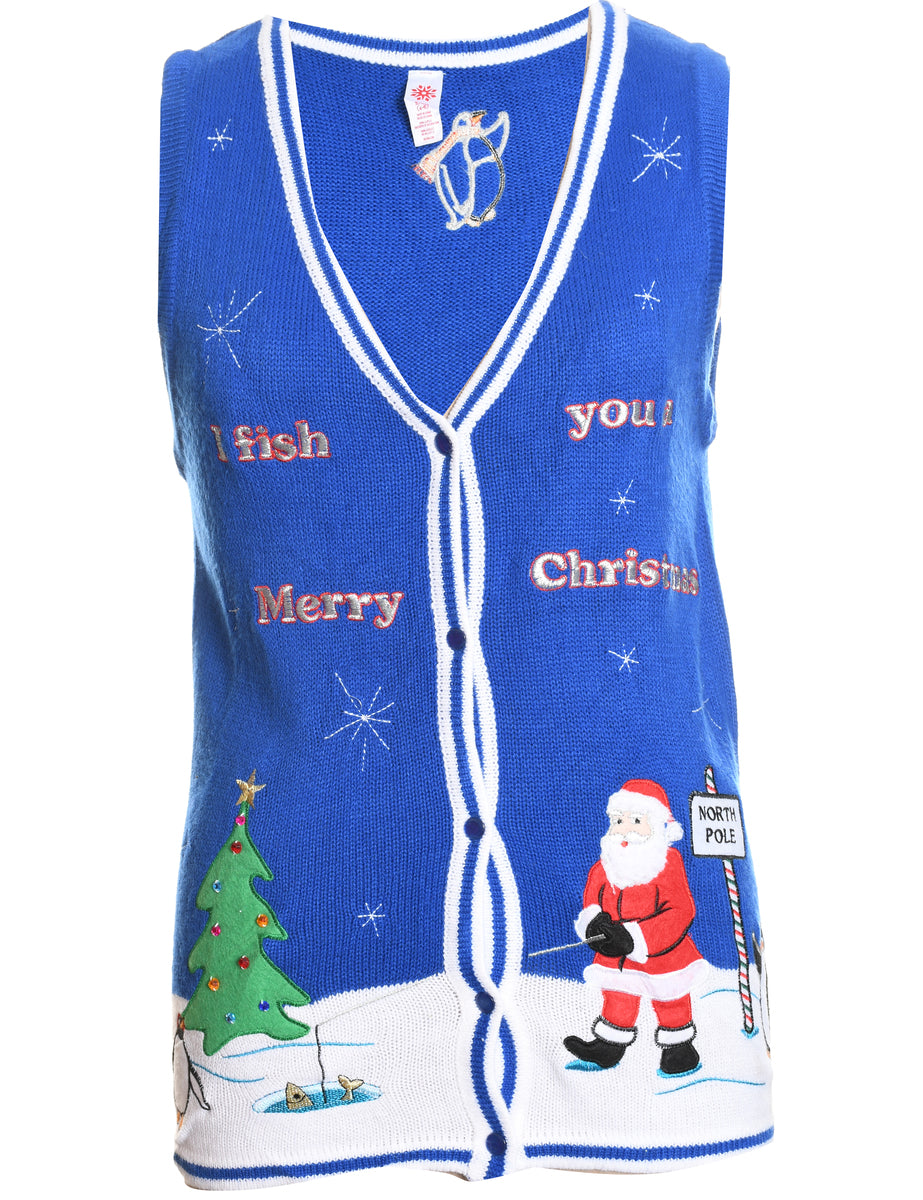 Santa claus sweater vest in blue with christmas tree design, a v-neck and an applique design.