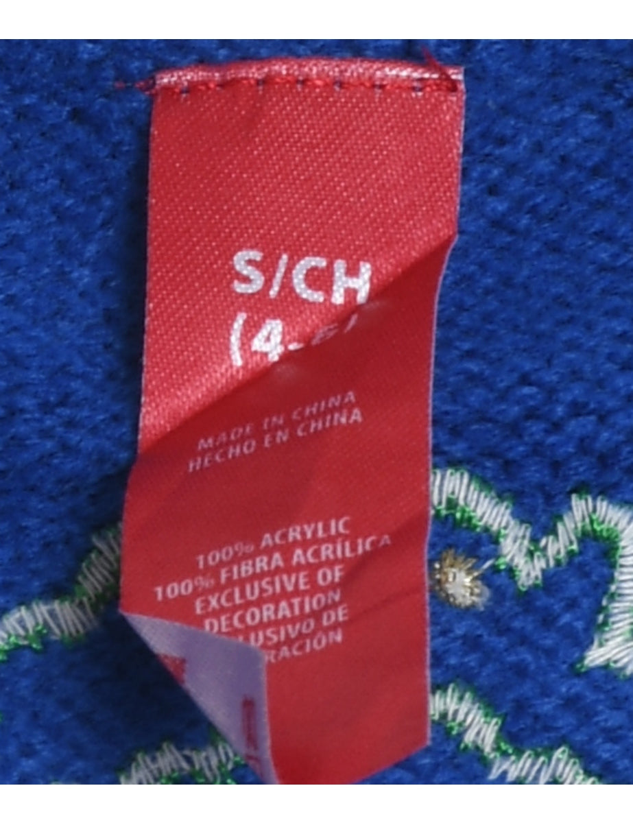 Santa claus christmas sweater vest comes in blue with a v-neck and embroidery.