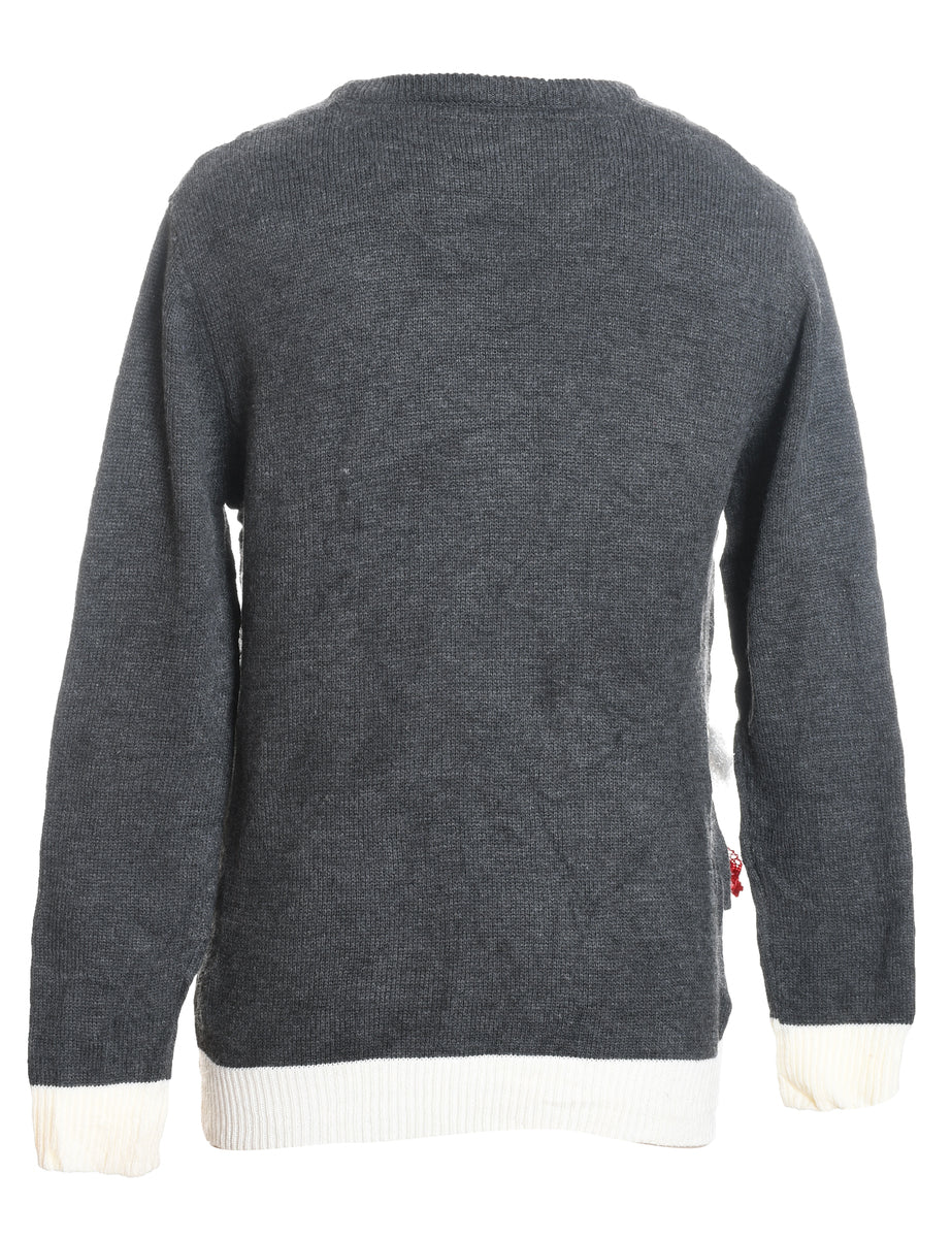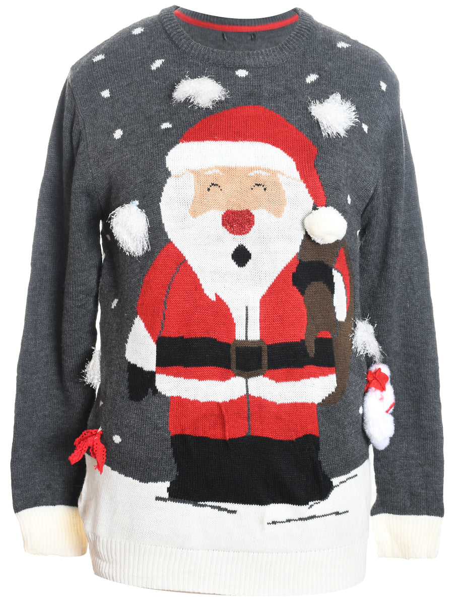 Santa Claus design dark grey Christmas jumper with a drop shoulder and pom poms.