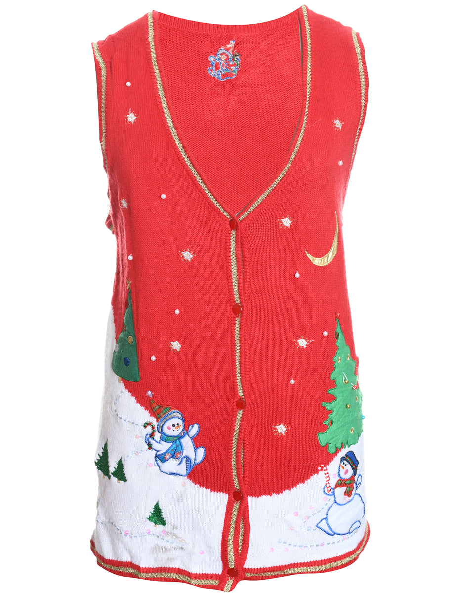 Snowman christmas sweater vest comes in red with a v-neck and beading.