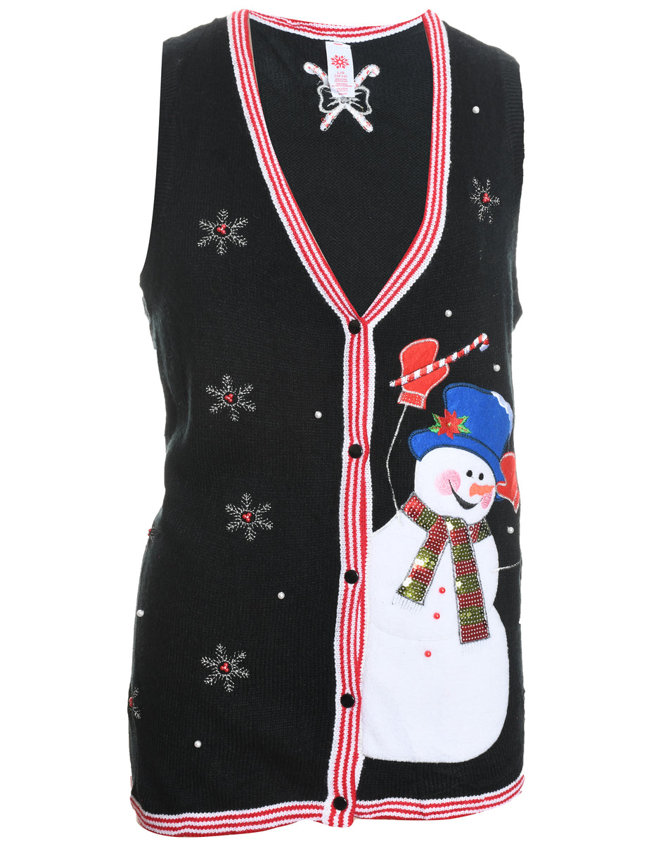 Snowman design black knit vest complete with a v-neck and an applique design.