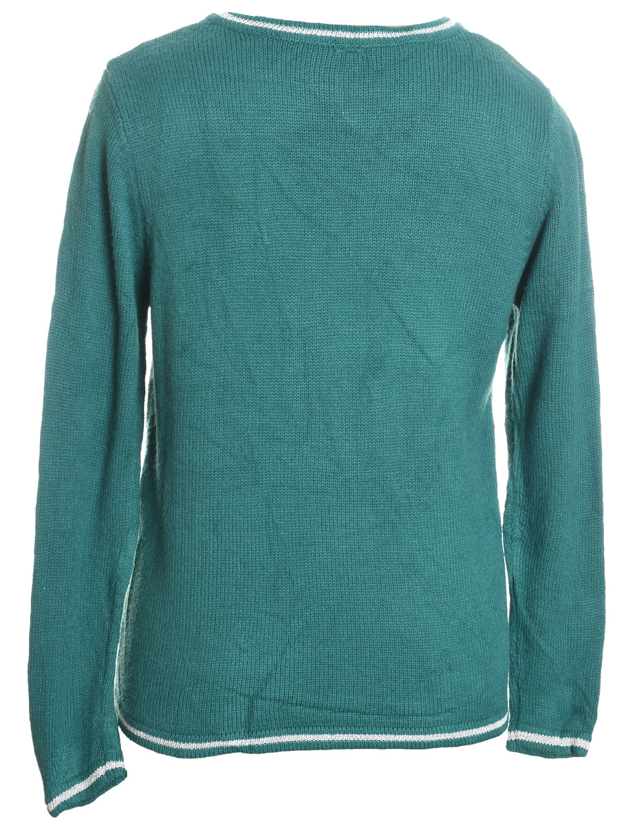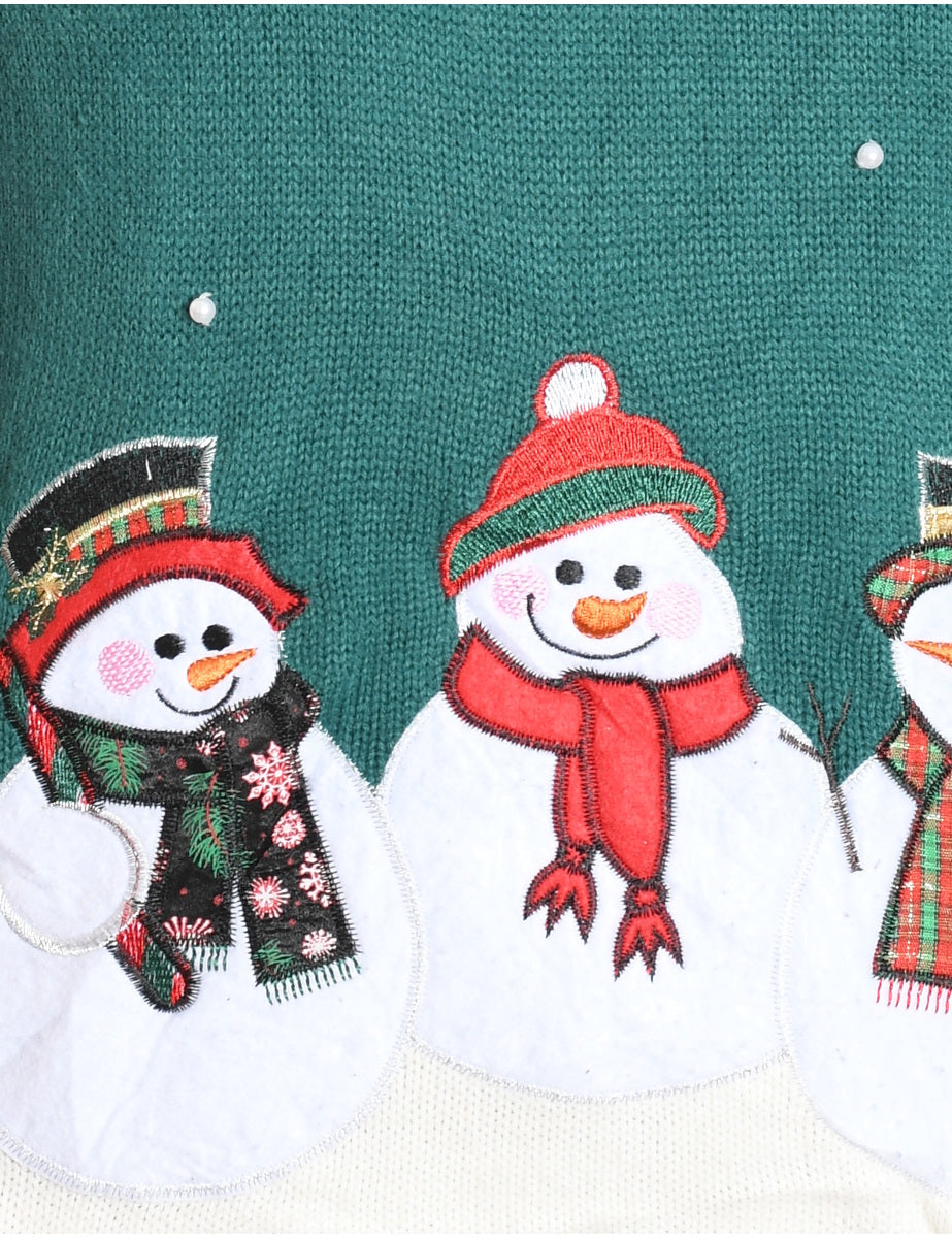 Snowman design green knit Christmas jumper complete with an applique design and beading.