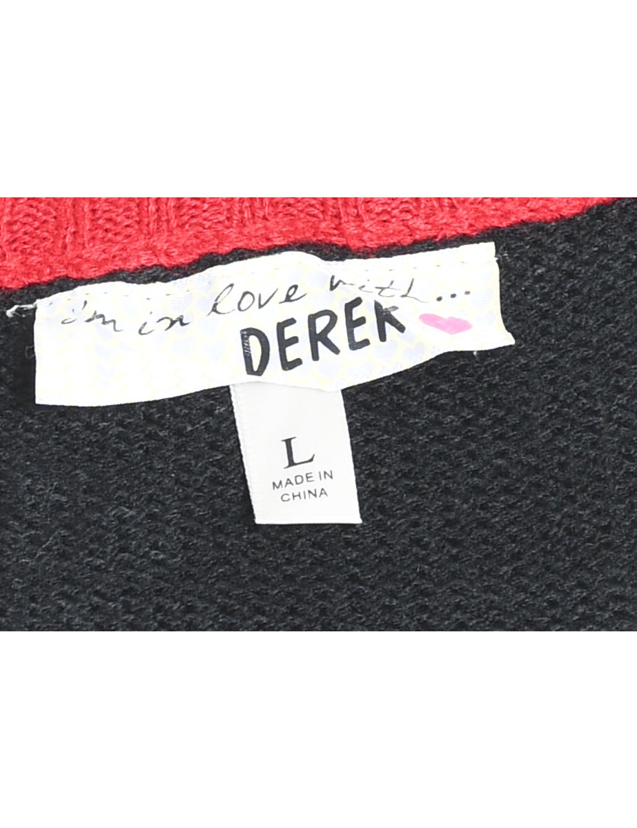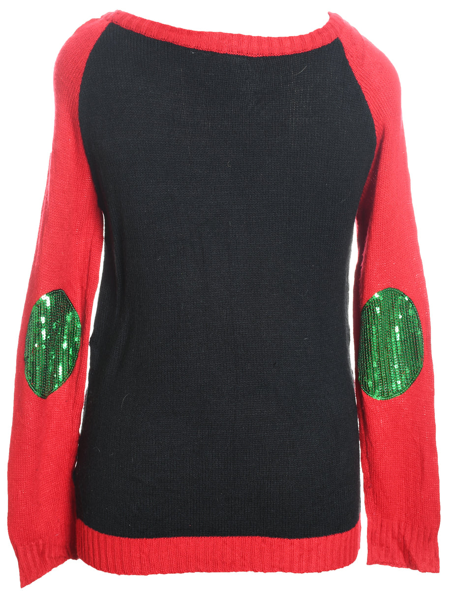 Festive print black christmas jumper with small bells attached and raglan sleeves.