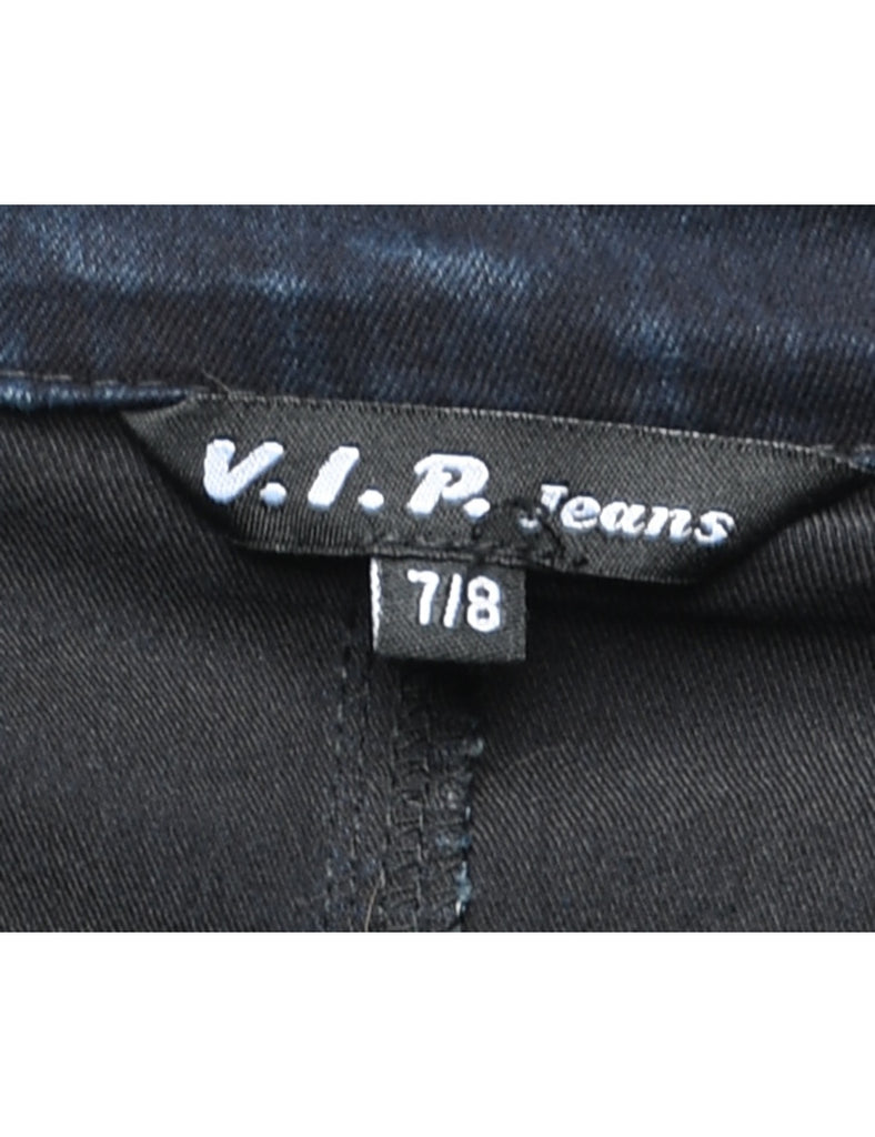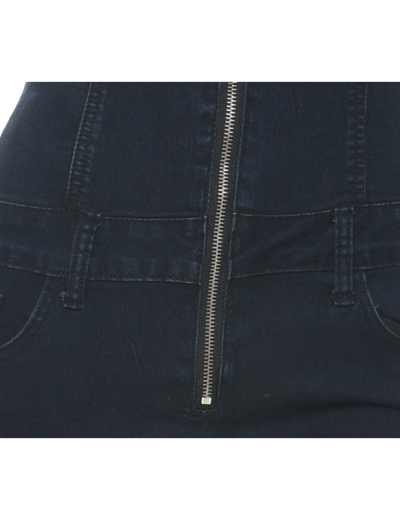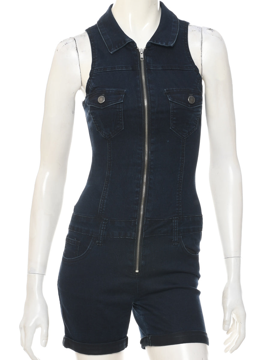 Zip front indigo playsuit with multiple pockets.