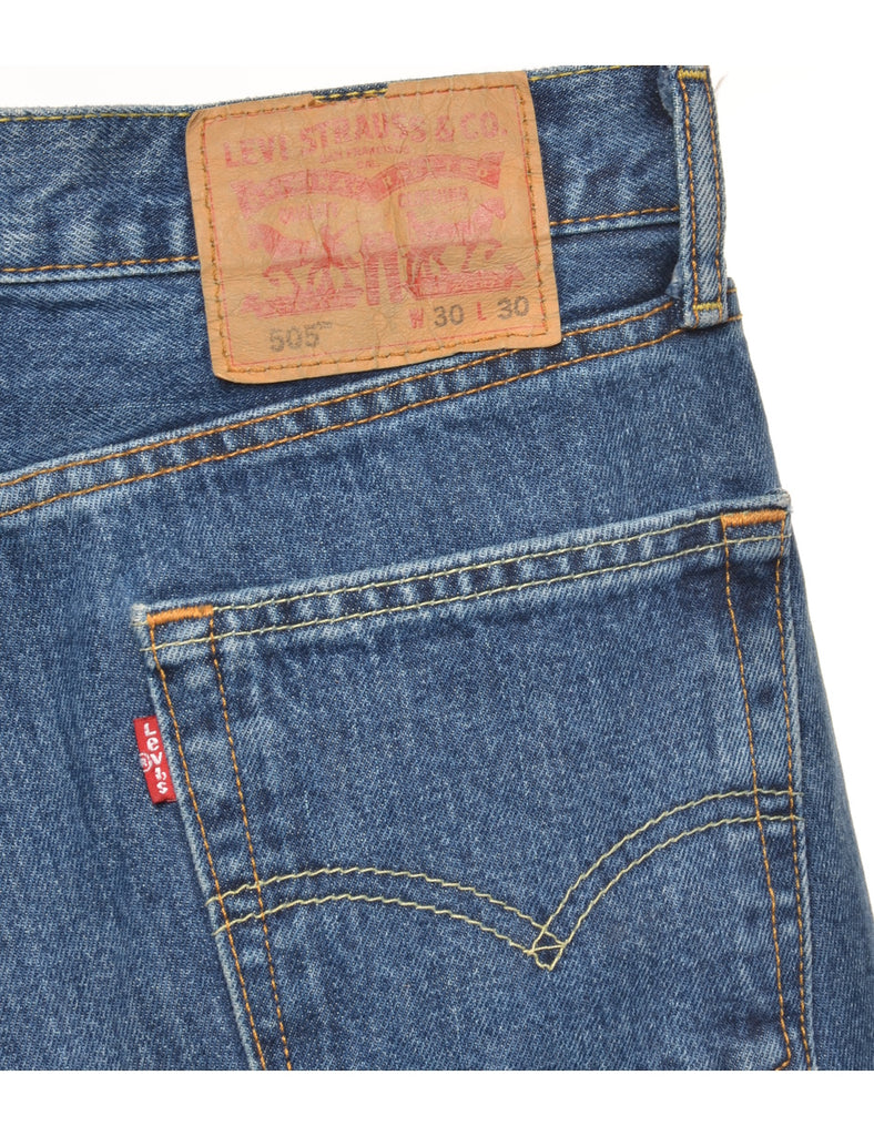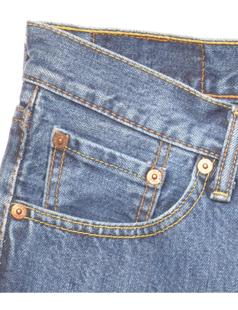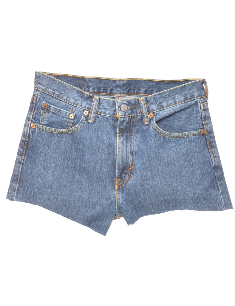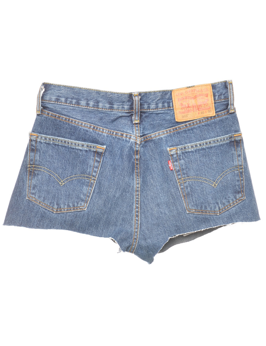 Levi's frayed edge denim shorts in medium wash with belt loops and pockets.