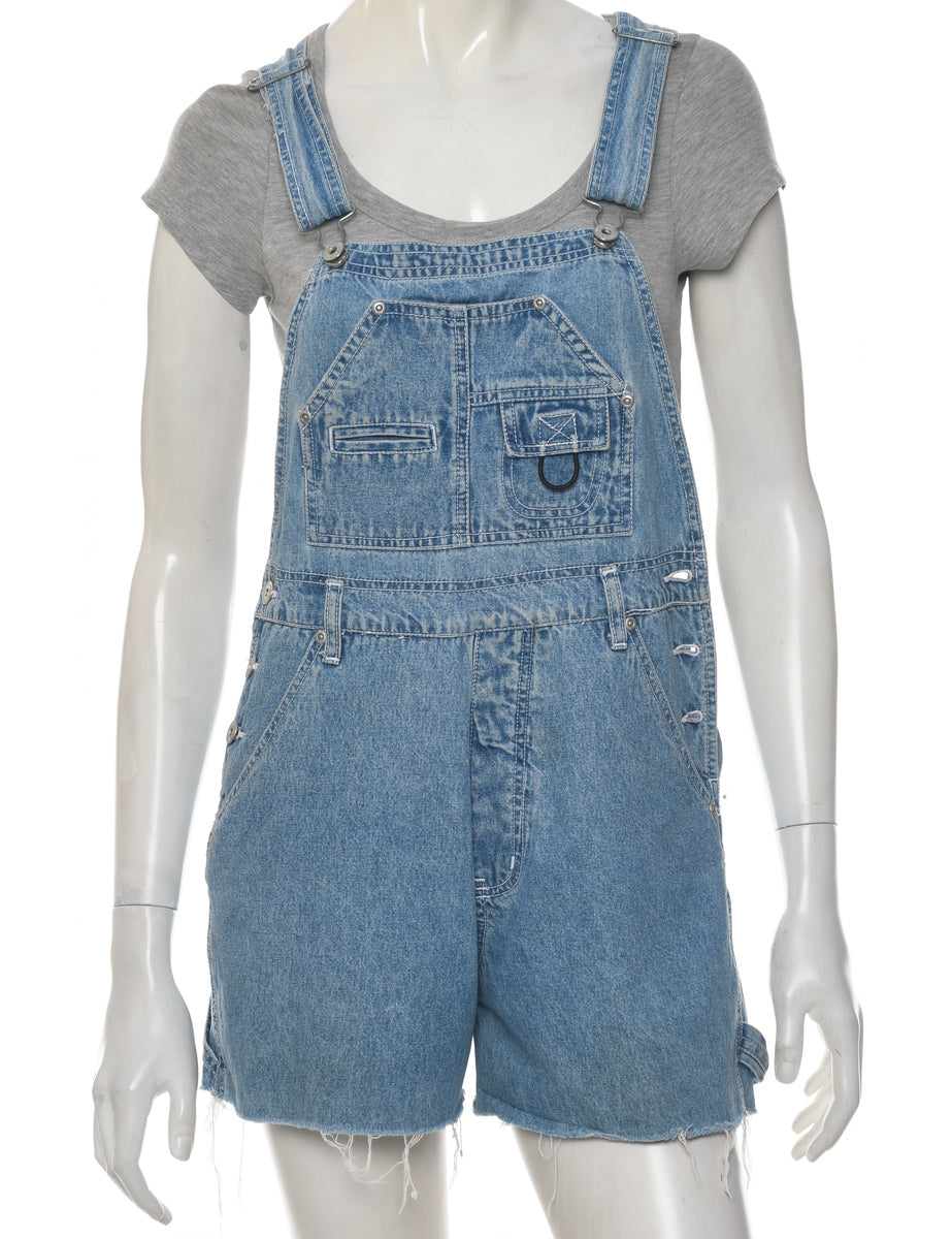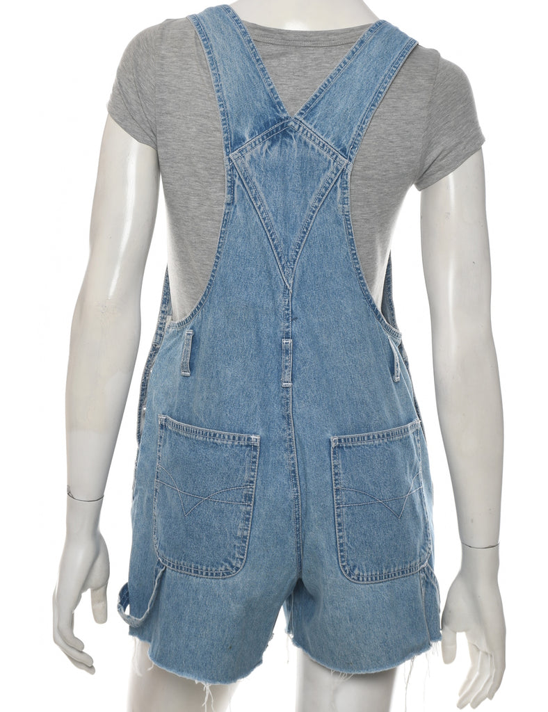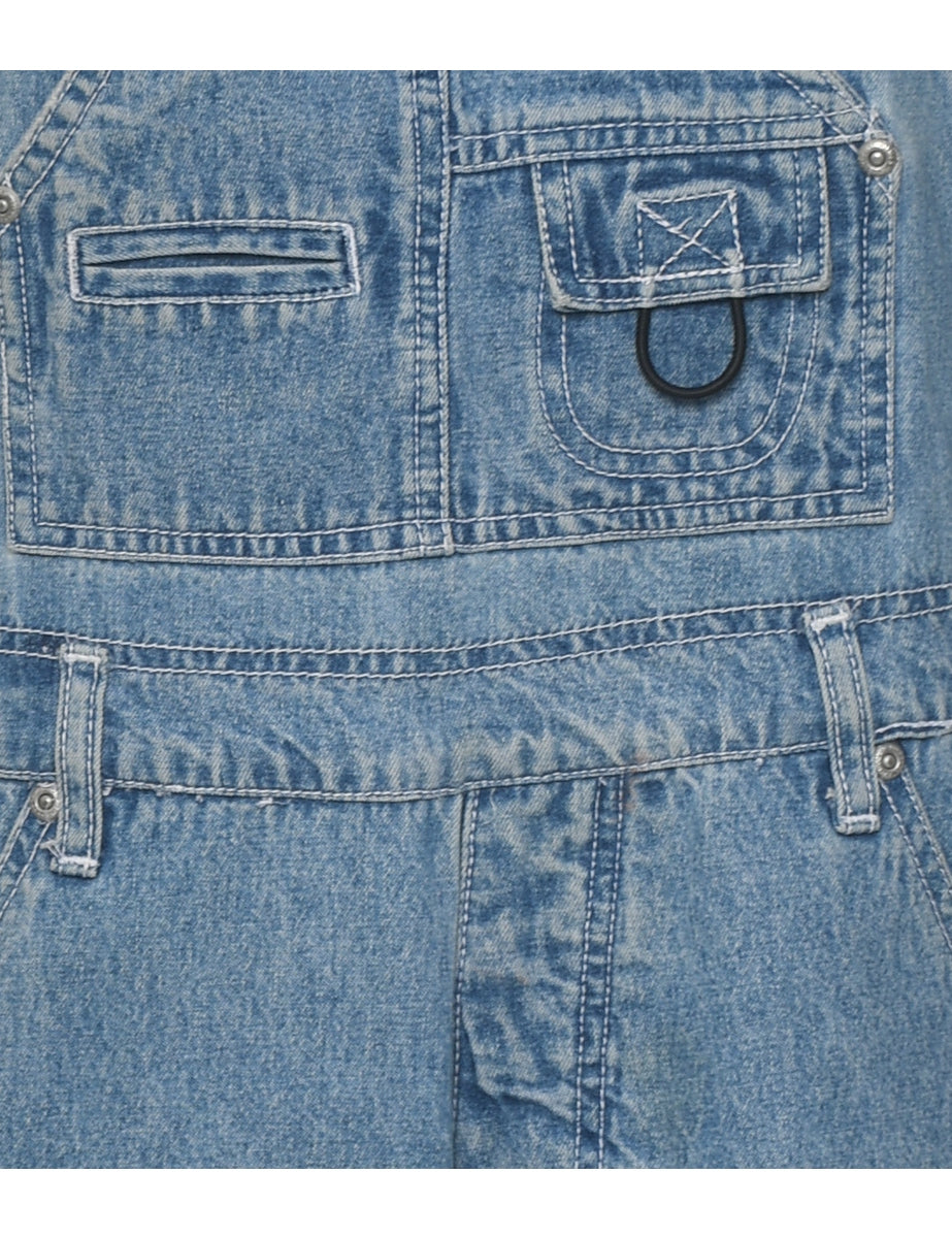 Straight leg cropped dungarees in light wash with adjustable strap and multiple pockets.