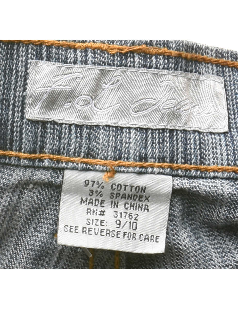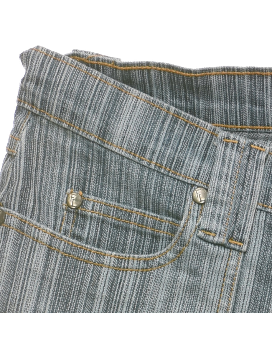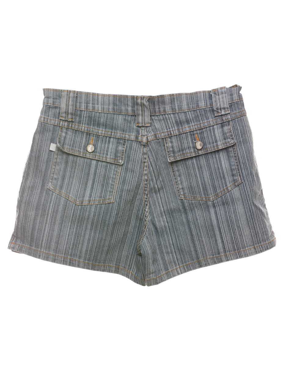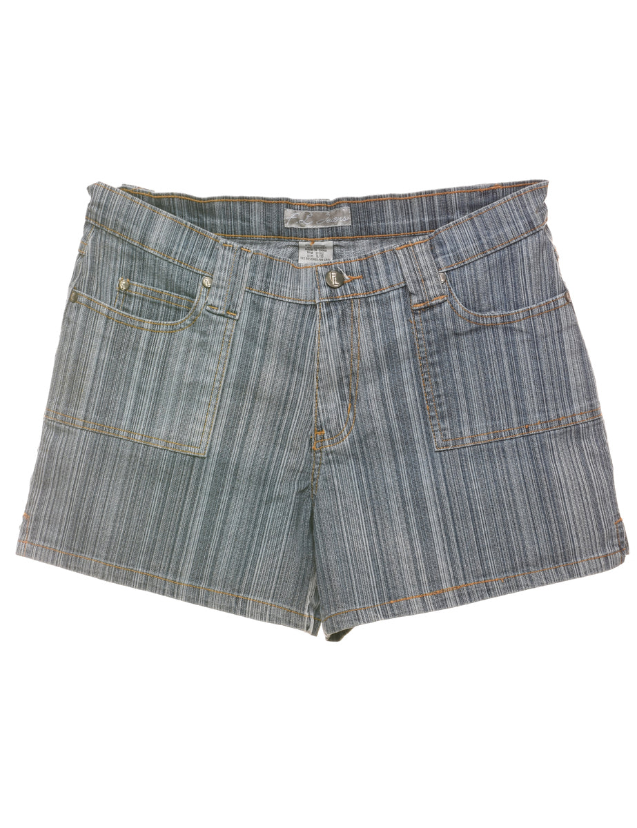 Striped denim shorts comes in medium wash with belt loops and multiple pockets.