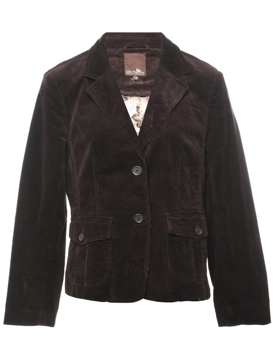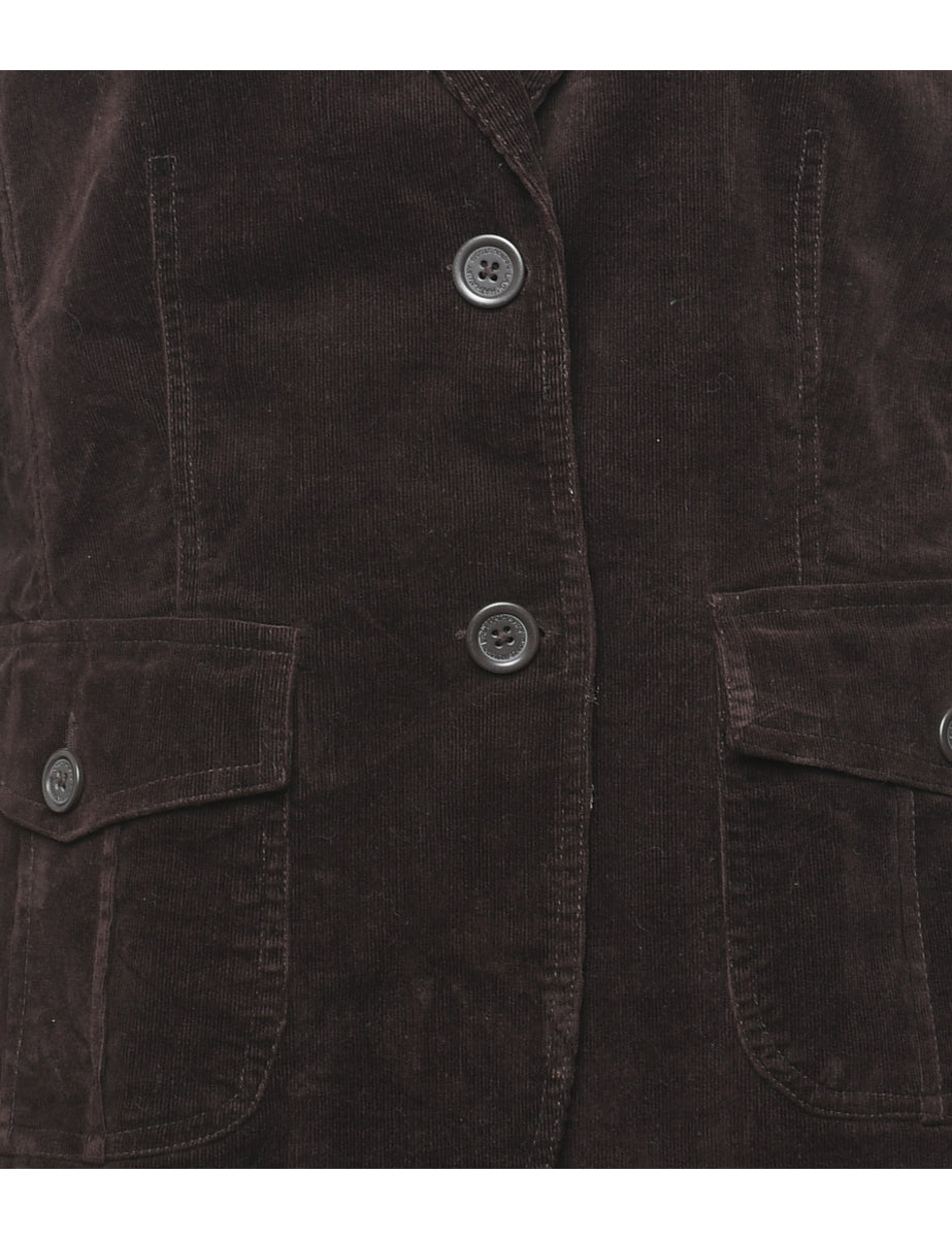 Corduroy dark brown blazer with built in shoulder pads and multiple pockets.