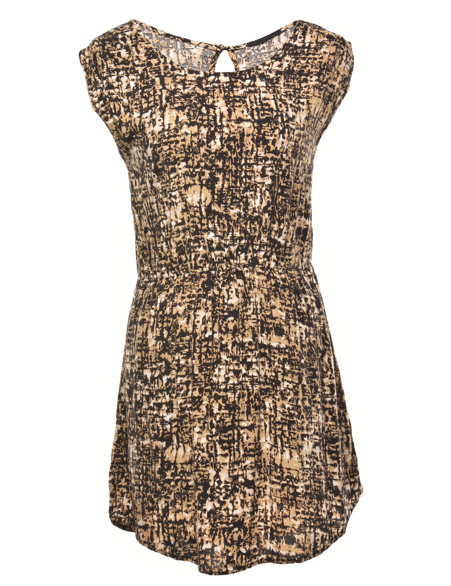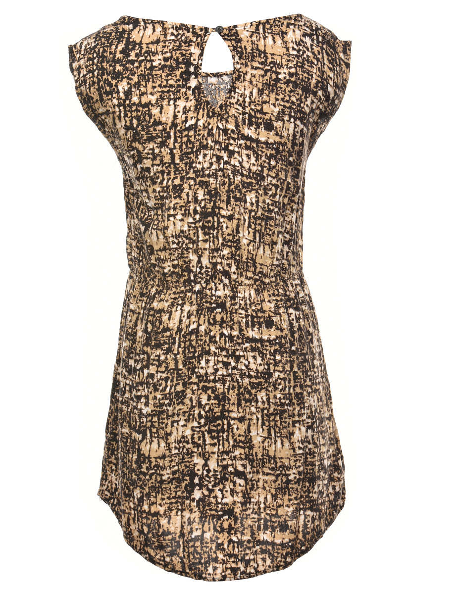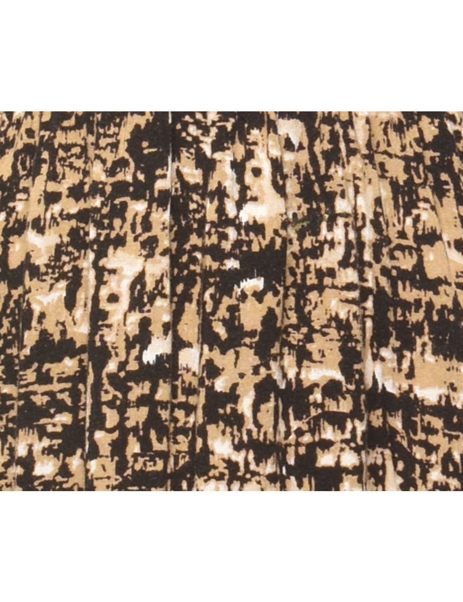 Black & light brown dress with a round neck and pleating.