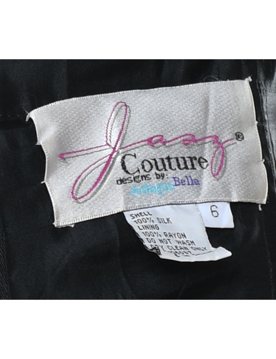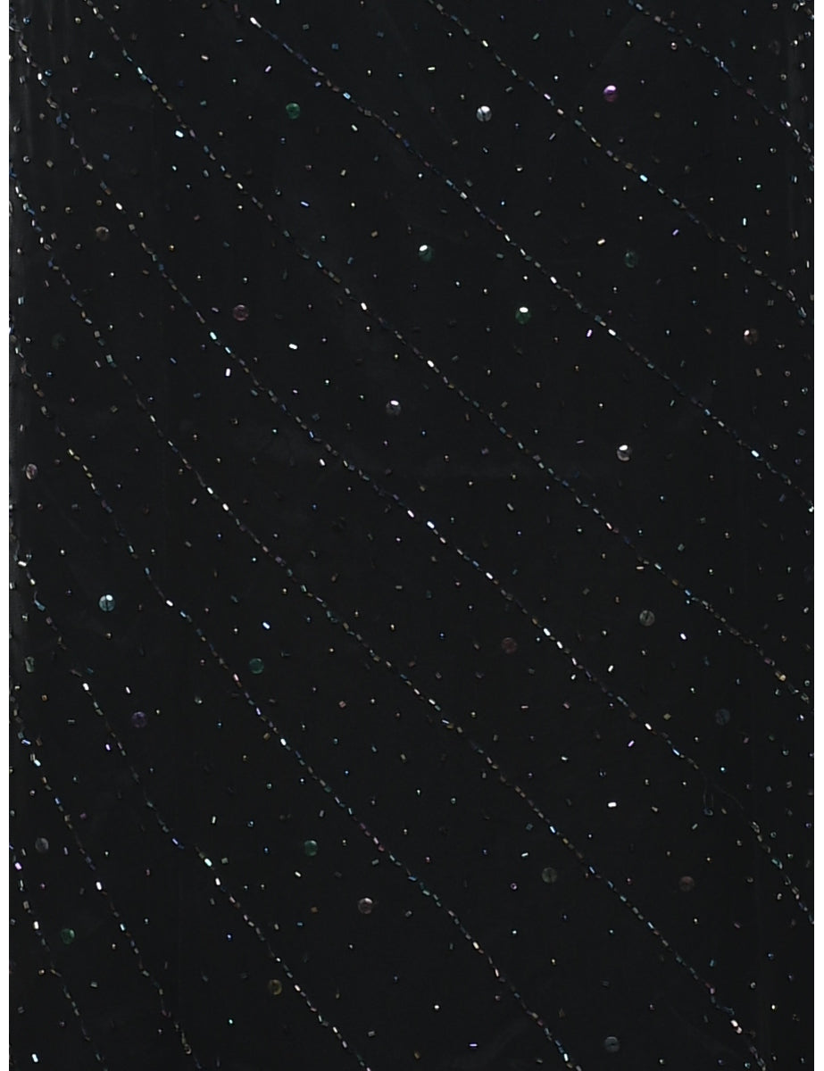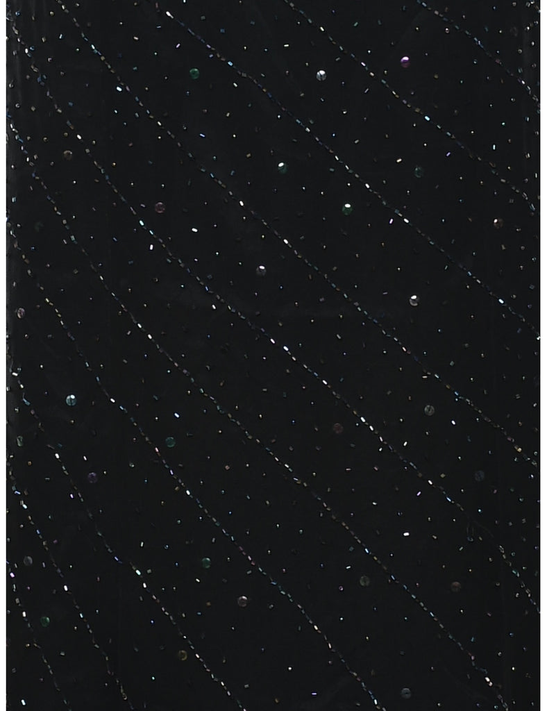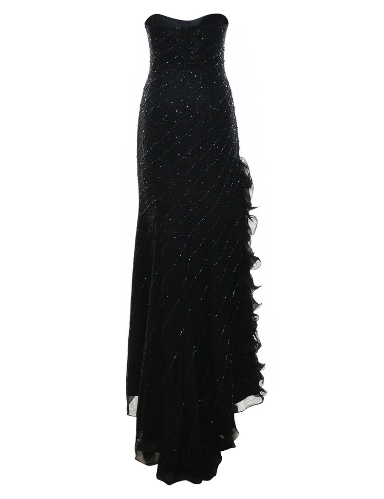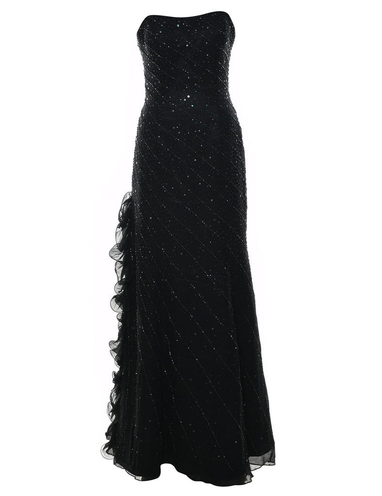 Sequined black silk party dress complete with a frilled hem and full lining and beading.