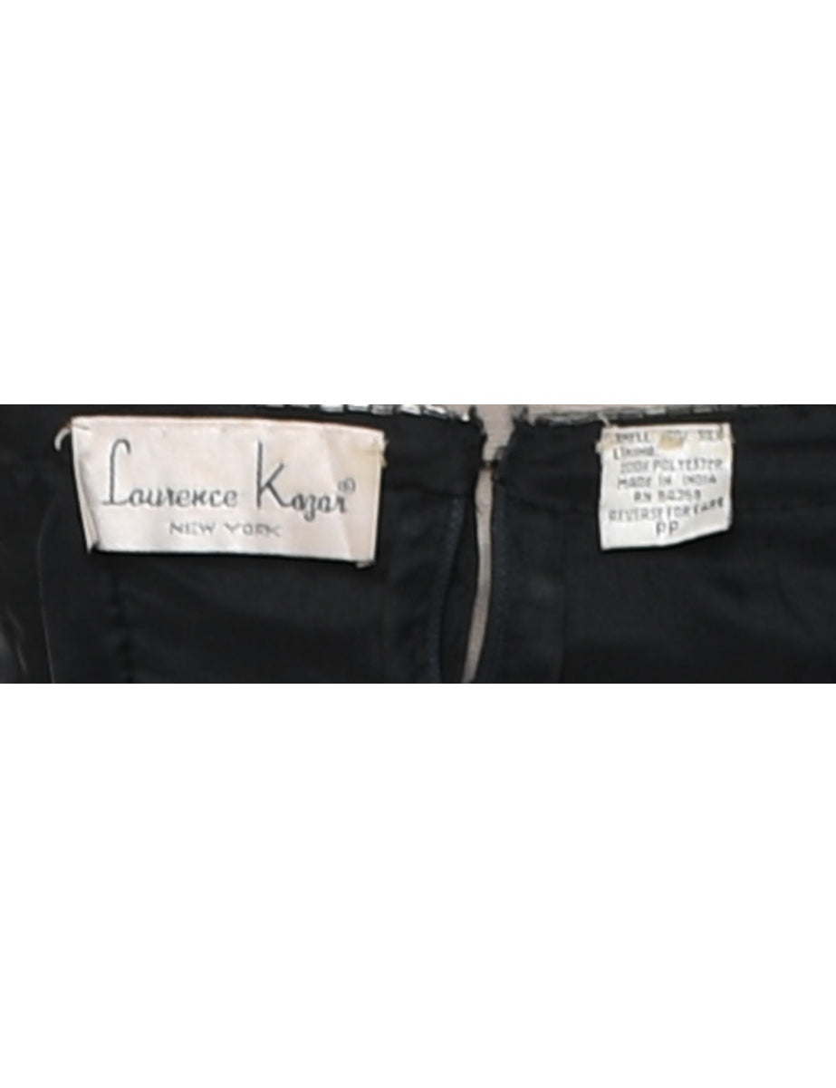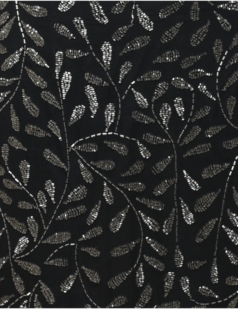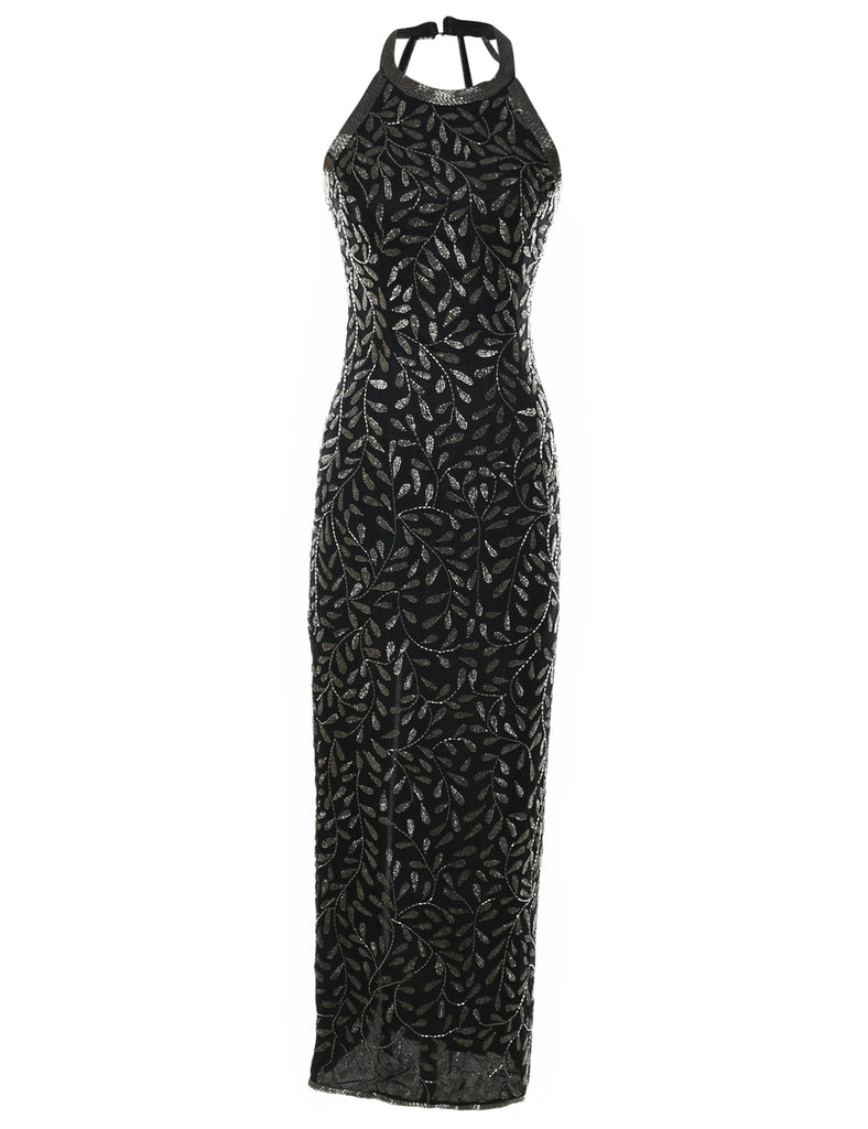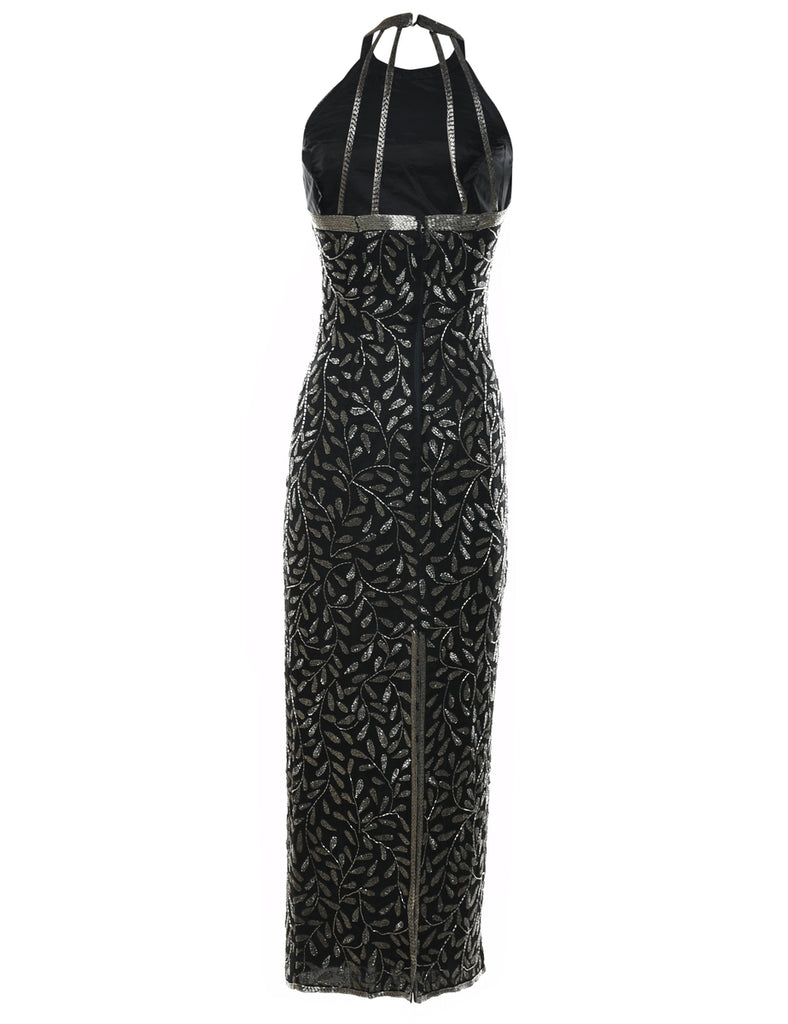 Black & Silver Leafy Print Halterneck Silk Beaded Party Dress - XS
