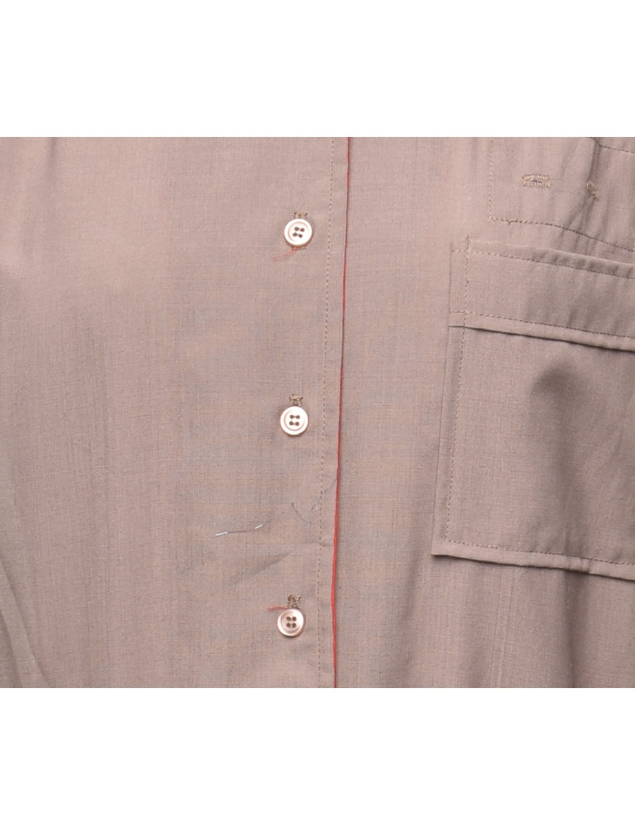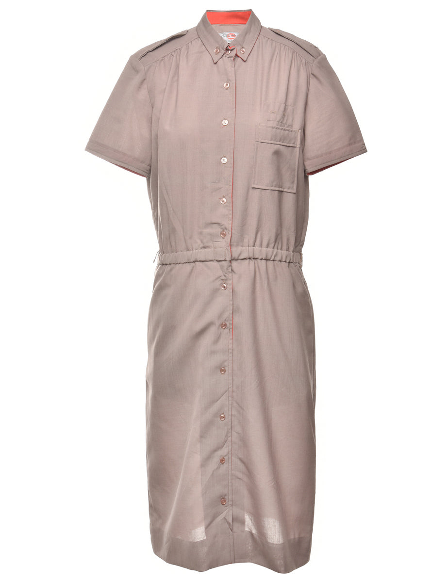 Button front shirt dress in brown with epaulettes and an elasticized waist.