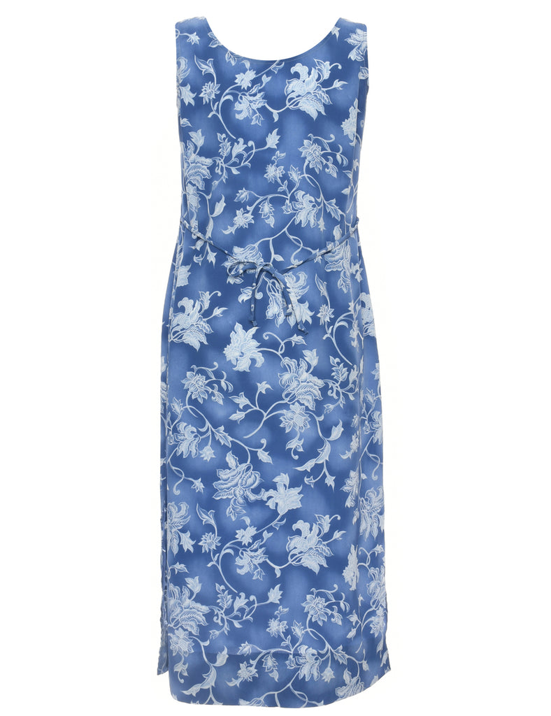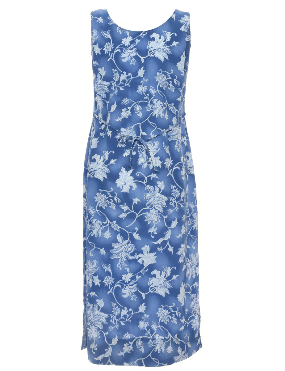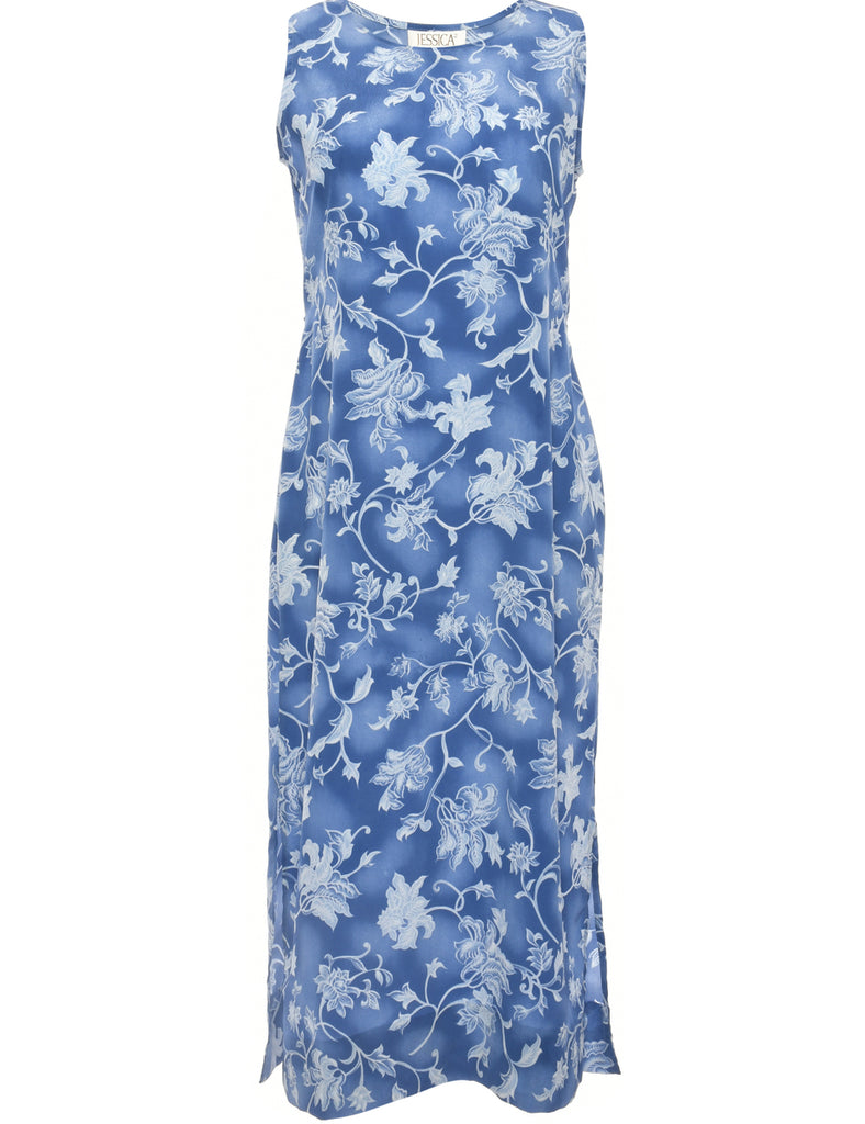 Floral dress in blue with side vents and a round neck.