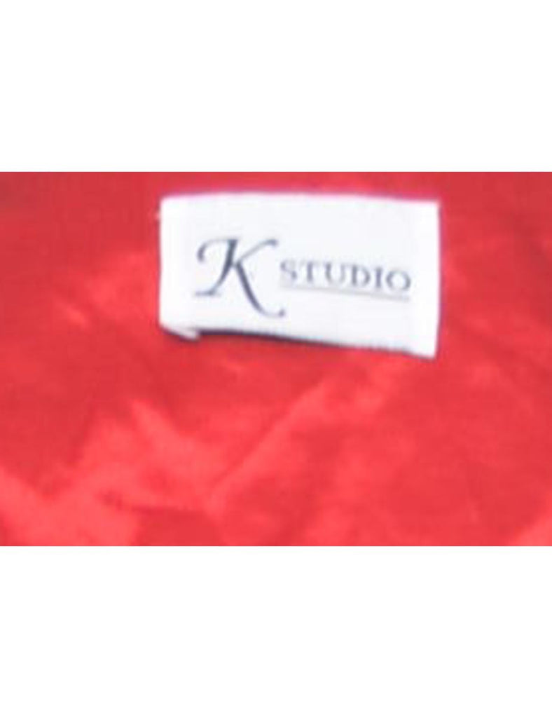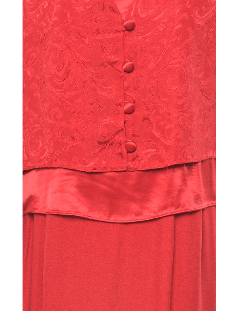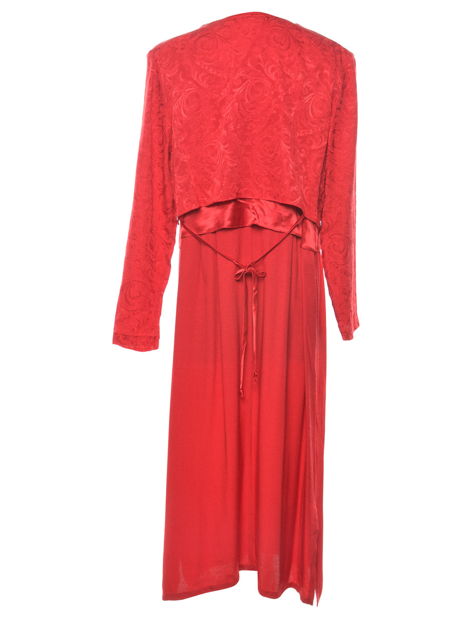 Long sleeved red evening dress with floral pattern, back tie and full lining.