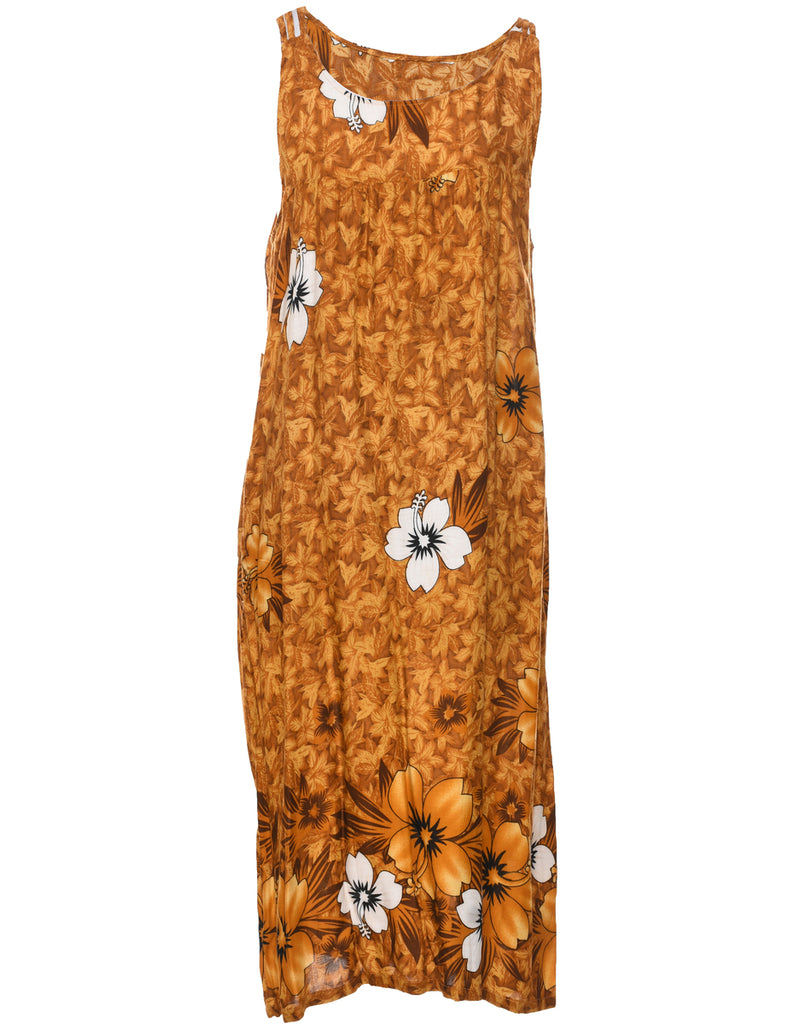 Floral print dress in mustard with a round neck.