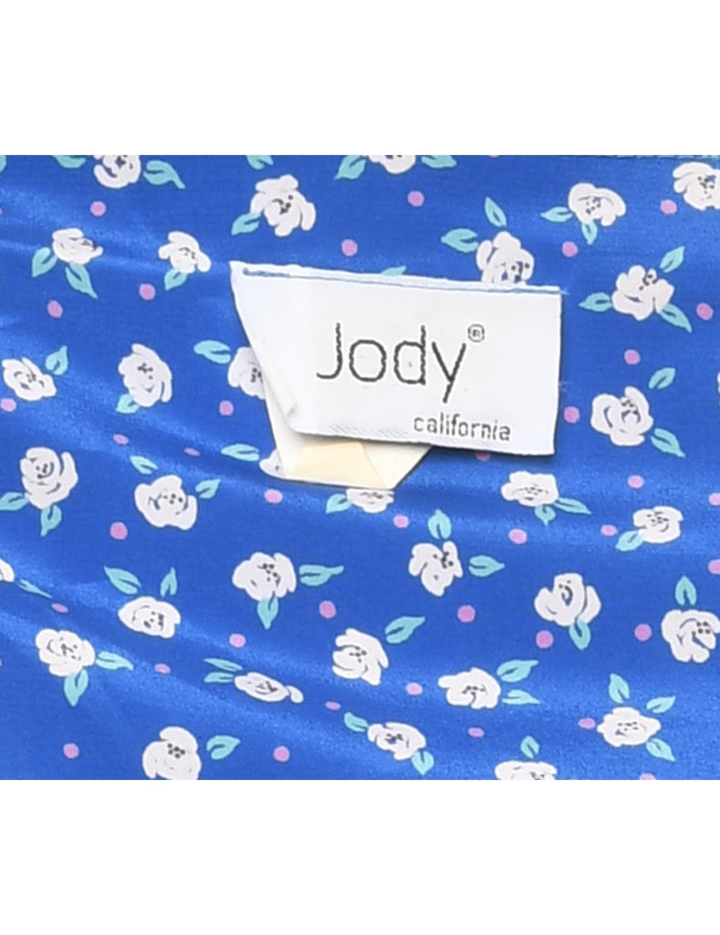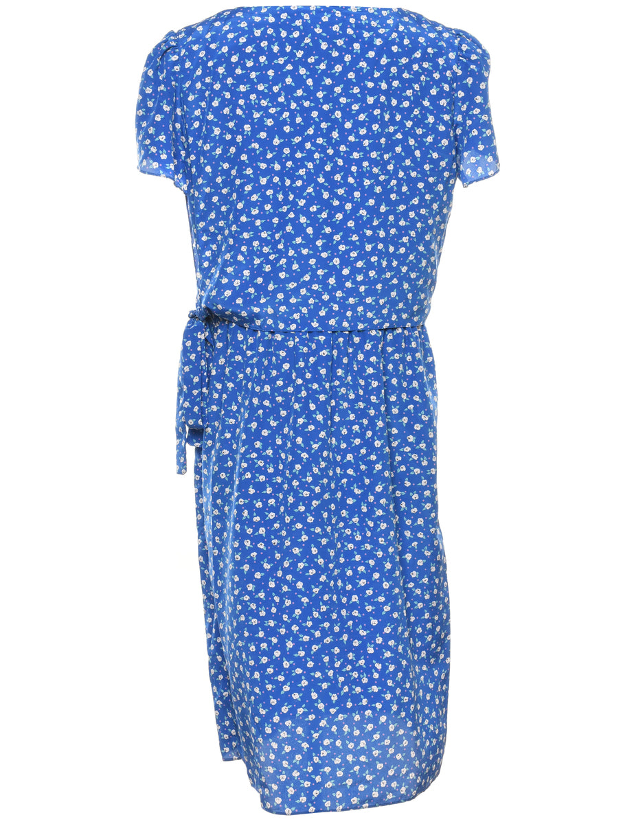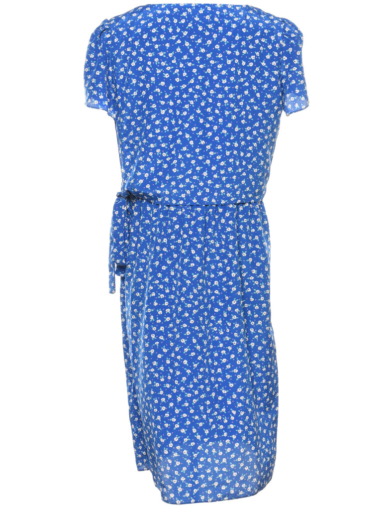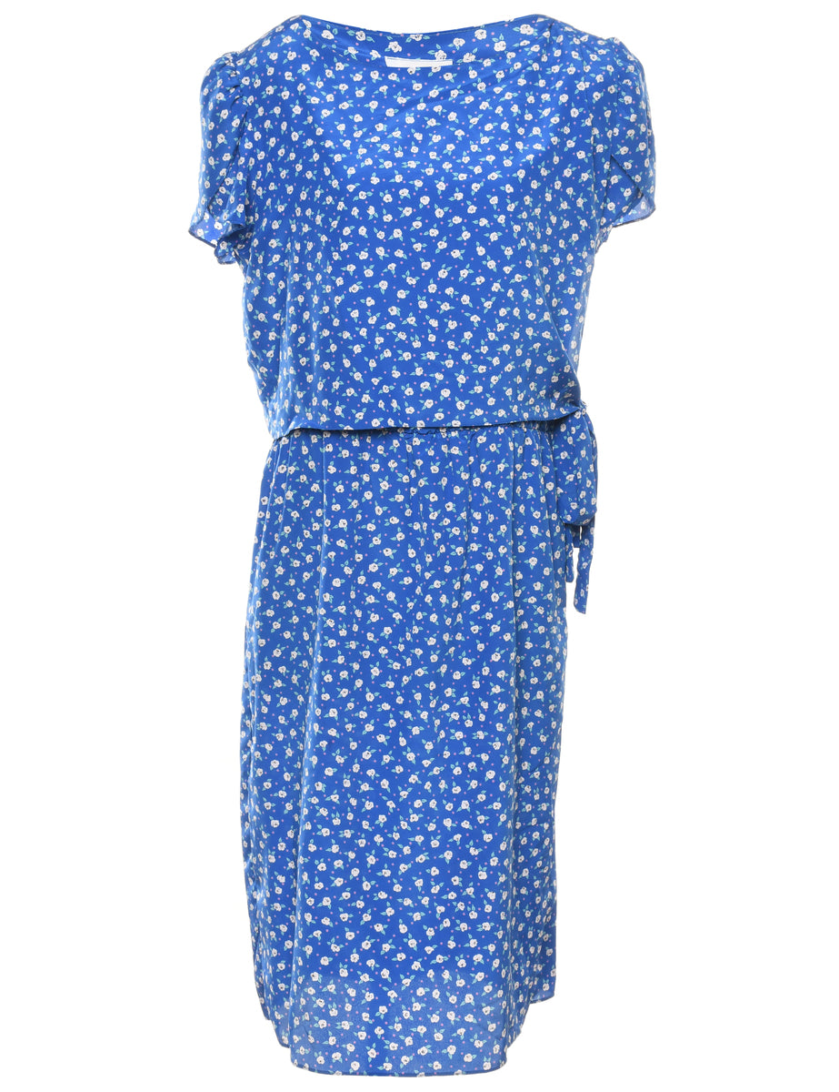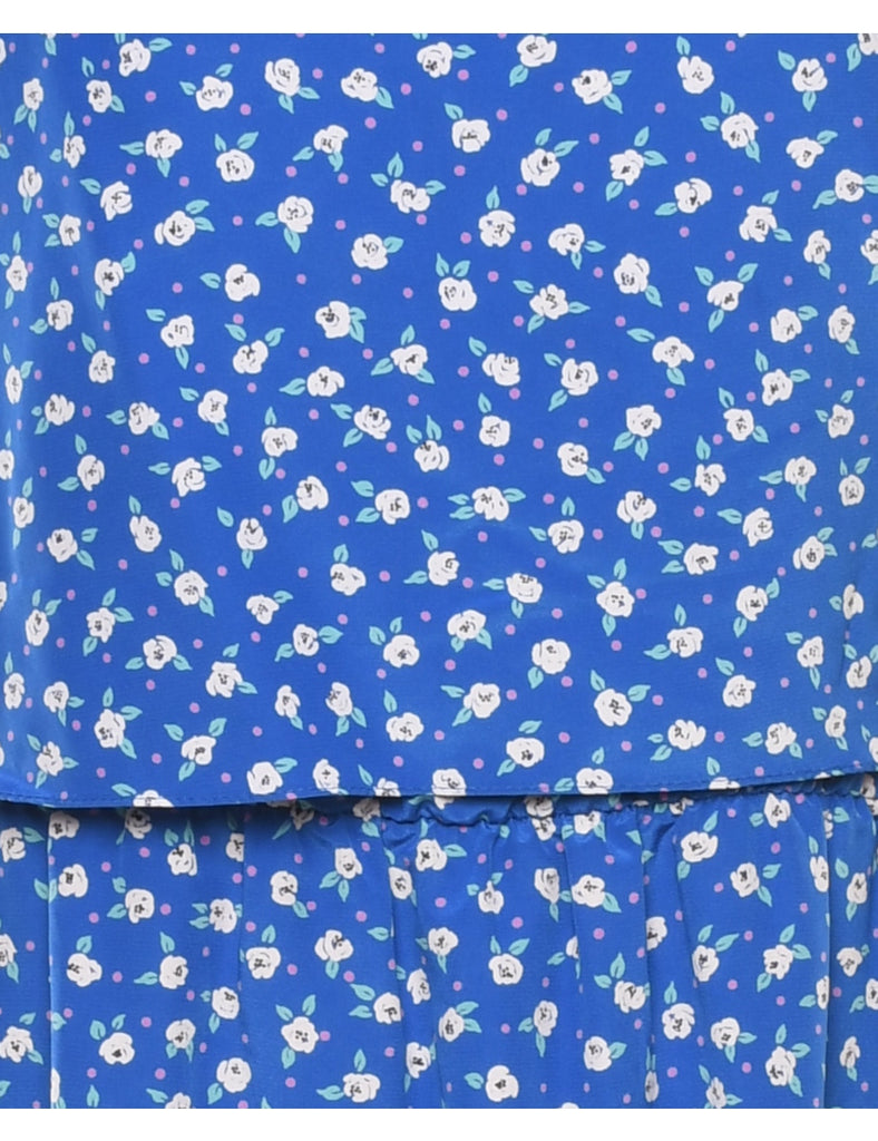 Floral print dress comes in blue with a boat neck and removable shoulder pads.