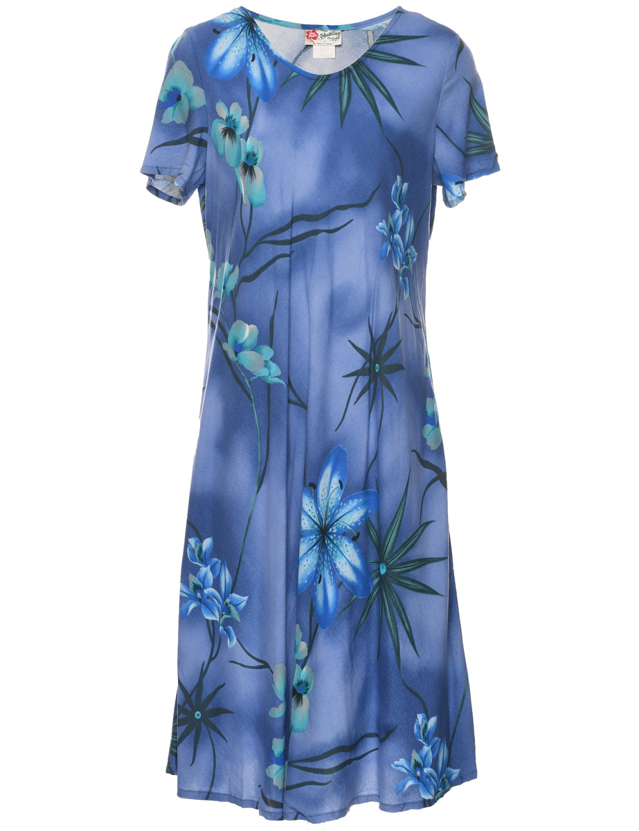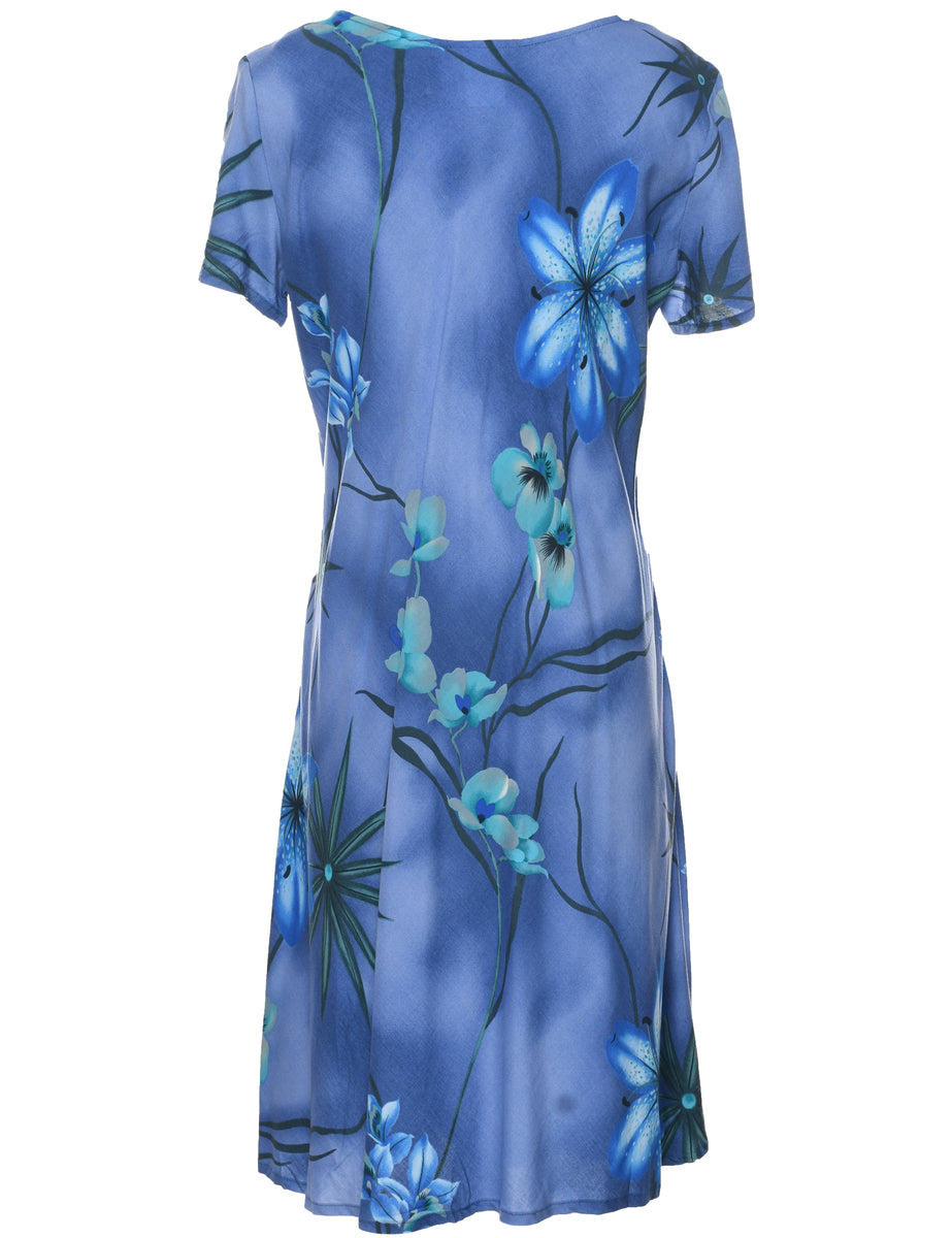 Floral print dress in blue with a round neck.
