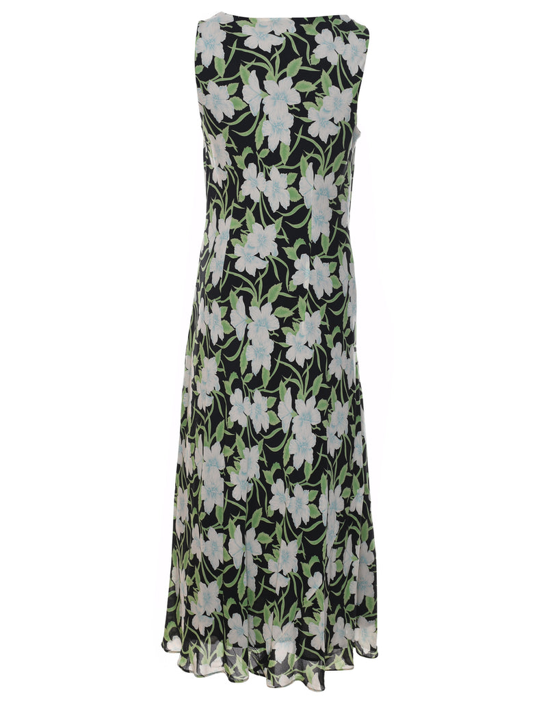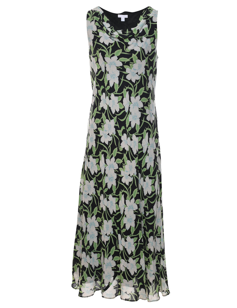 Floral print maxi dress. Comes in black with a cowl neck and full lining.