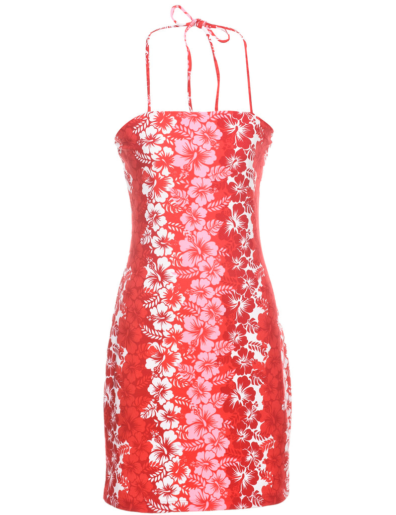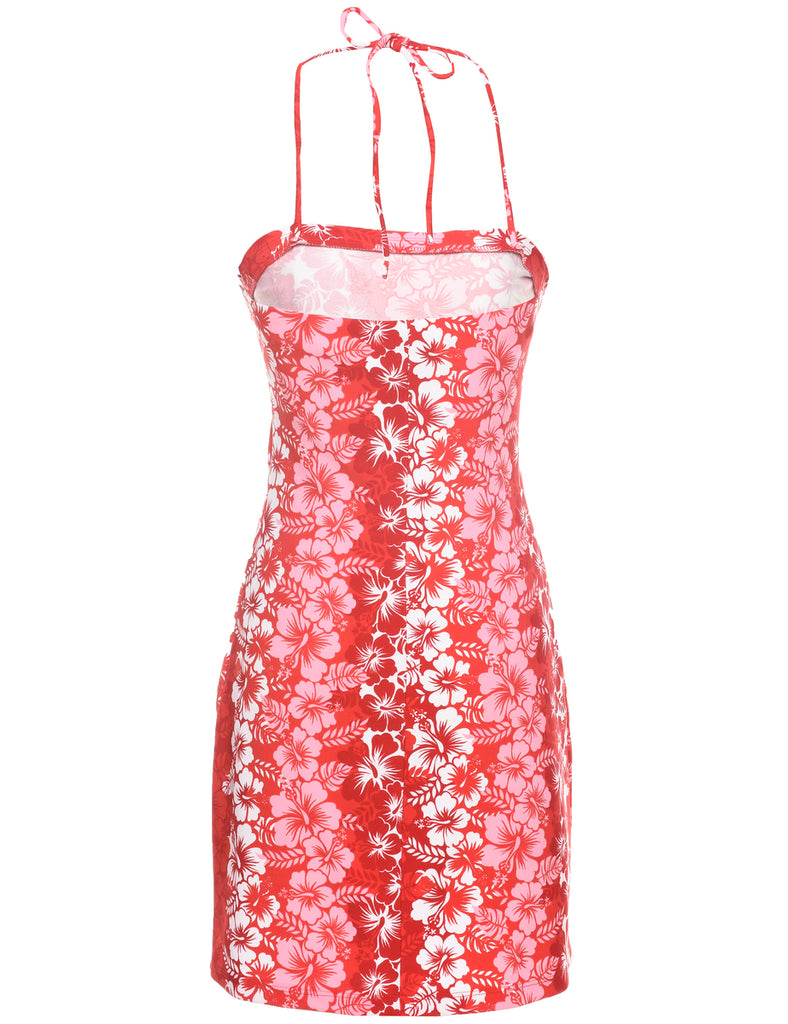 Floral print red mini dress with a halterneck and elasticated bust.
