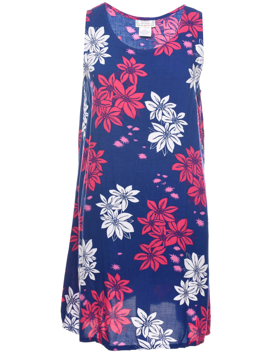 Floral print blue shift dress with a round neck.