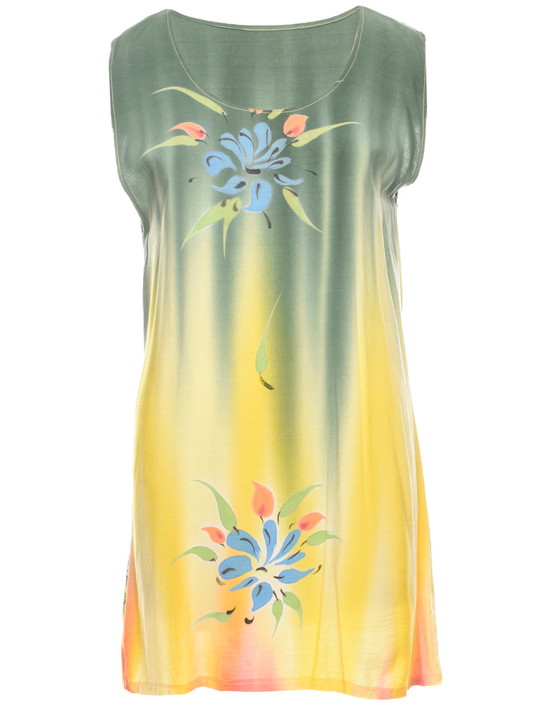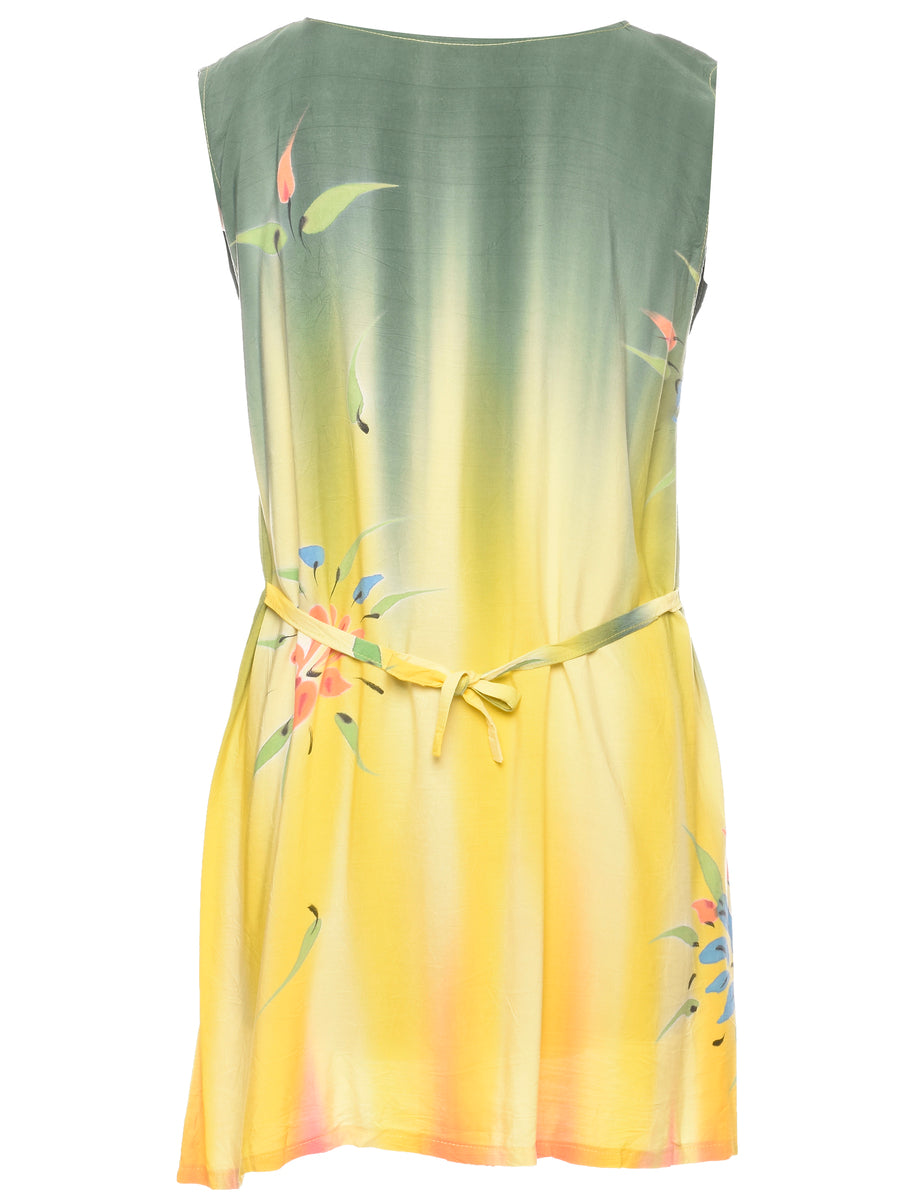 Floral print shift dress comes in green & yellow with back tie and a round neck.