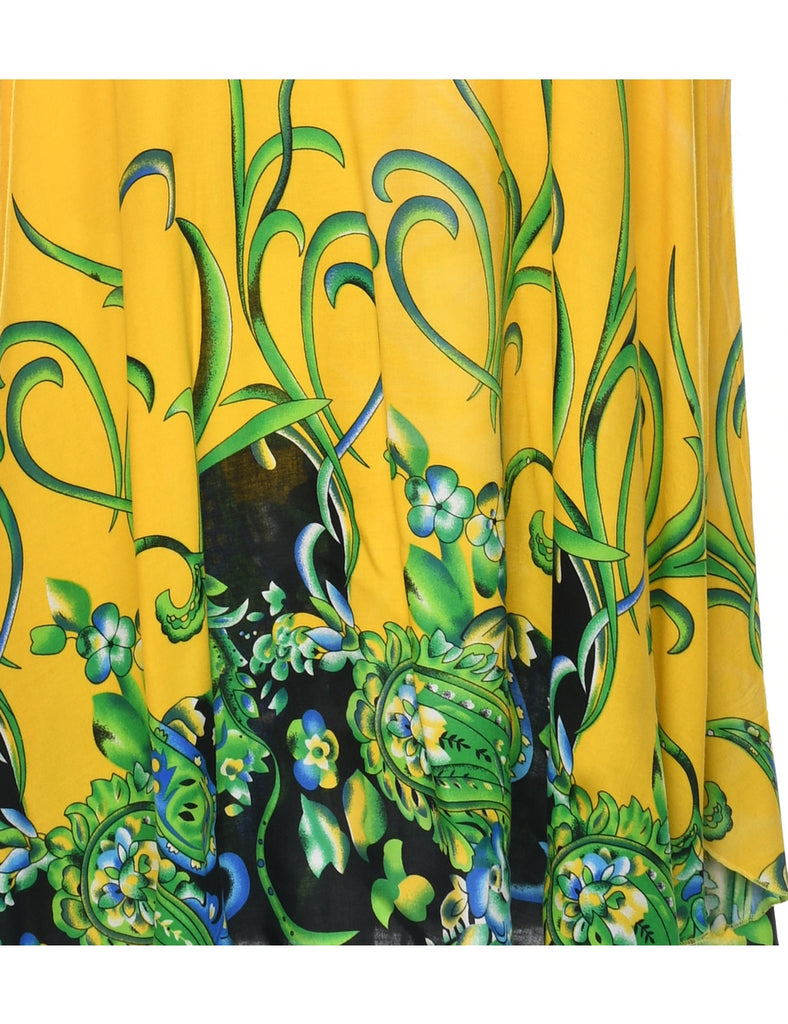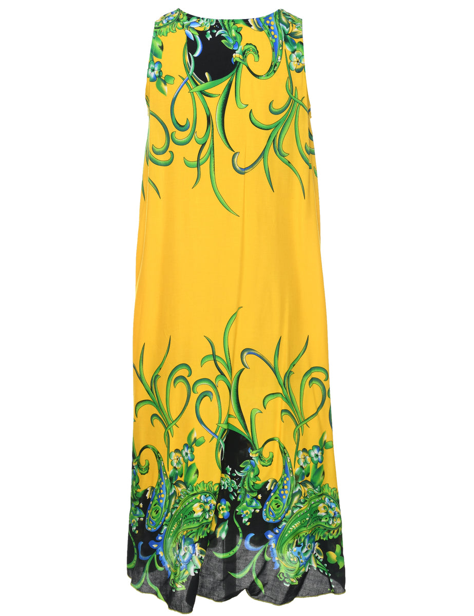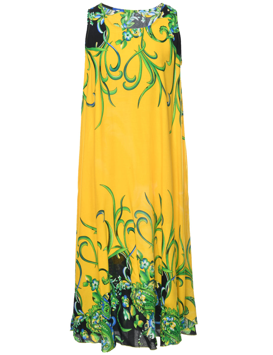 Floral print shift dress in yellow with a round neck.