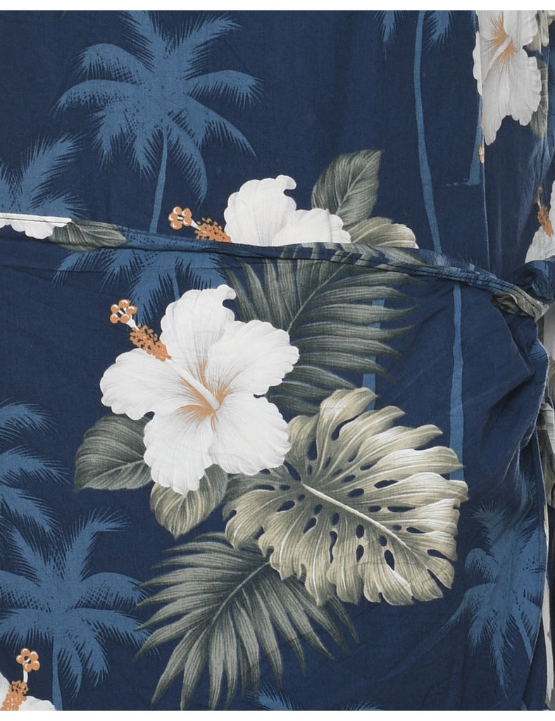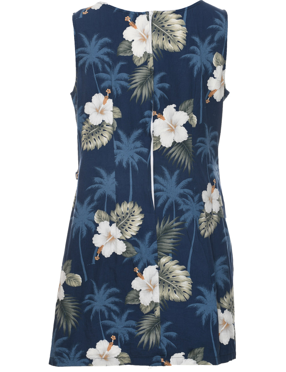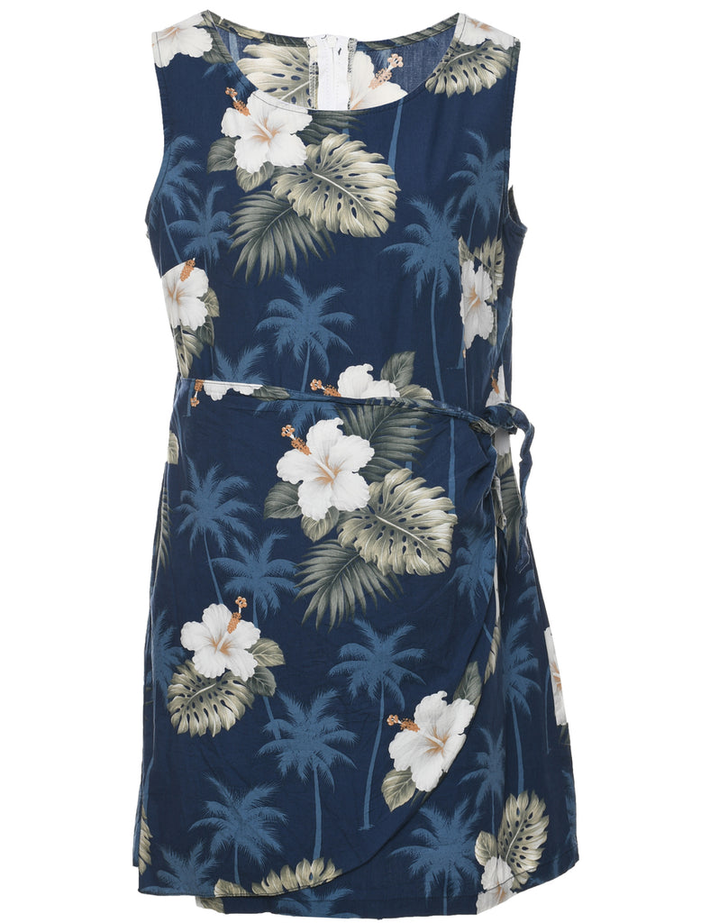 Floral print sleeveless dress comes in navy with a round neck and a tiered skirt.