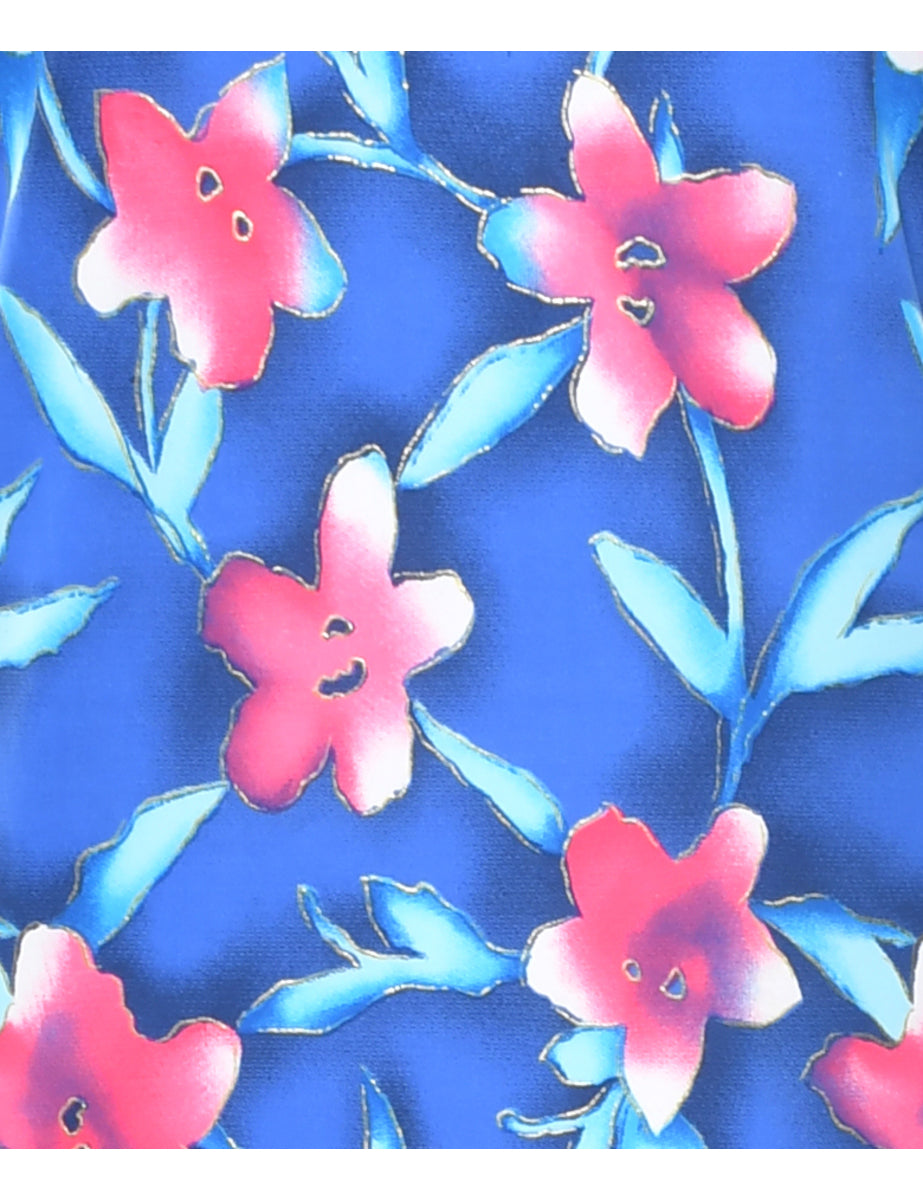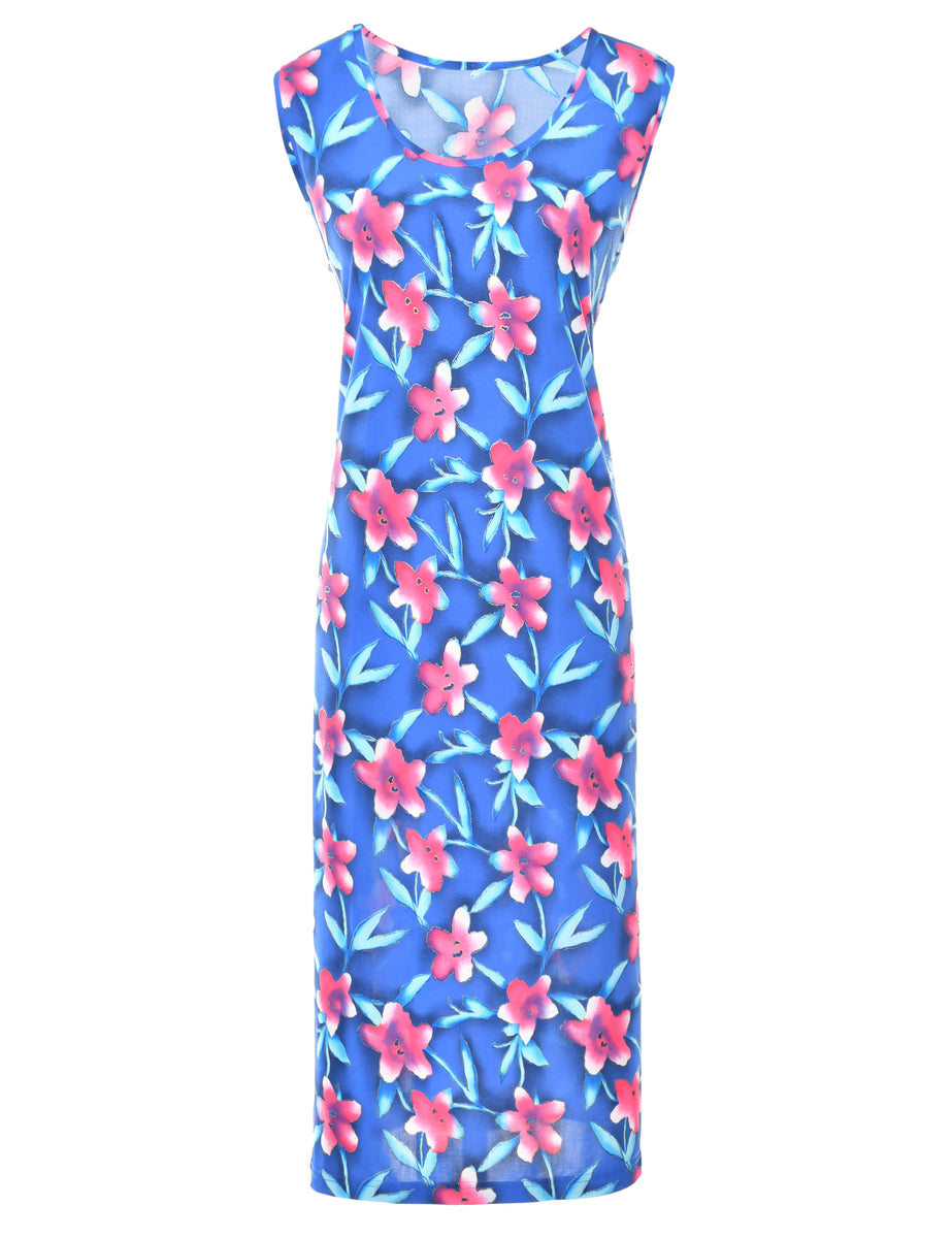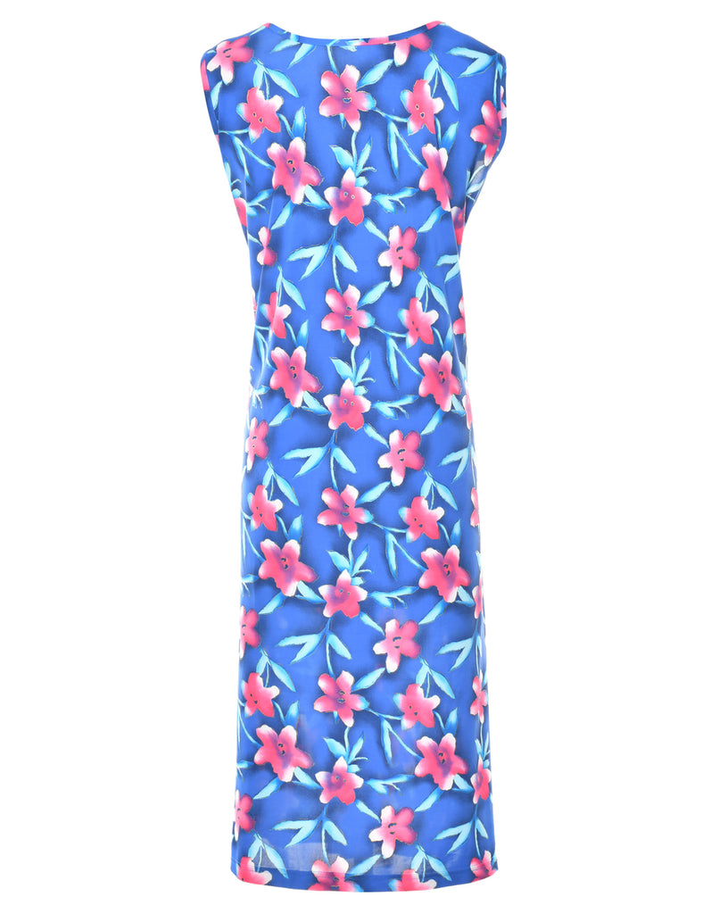 Floral print sleeveless dress. Comes in blue with a round neck.