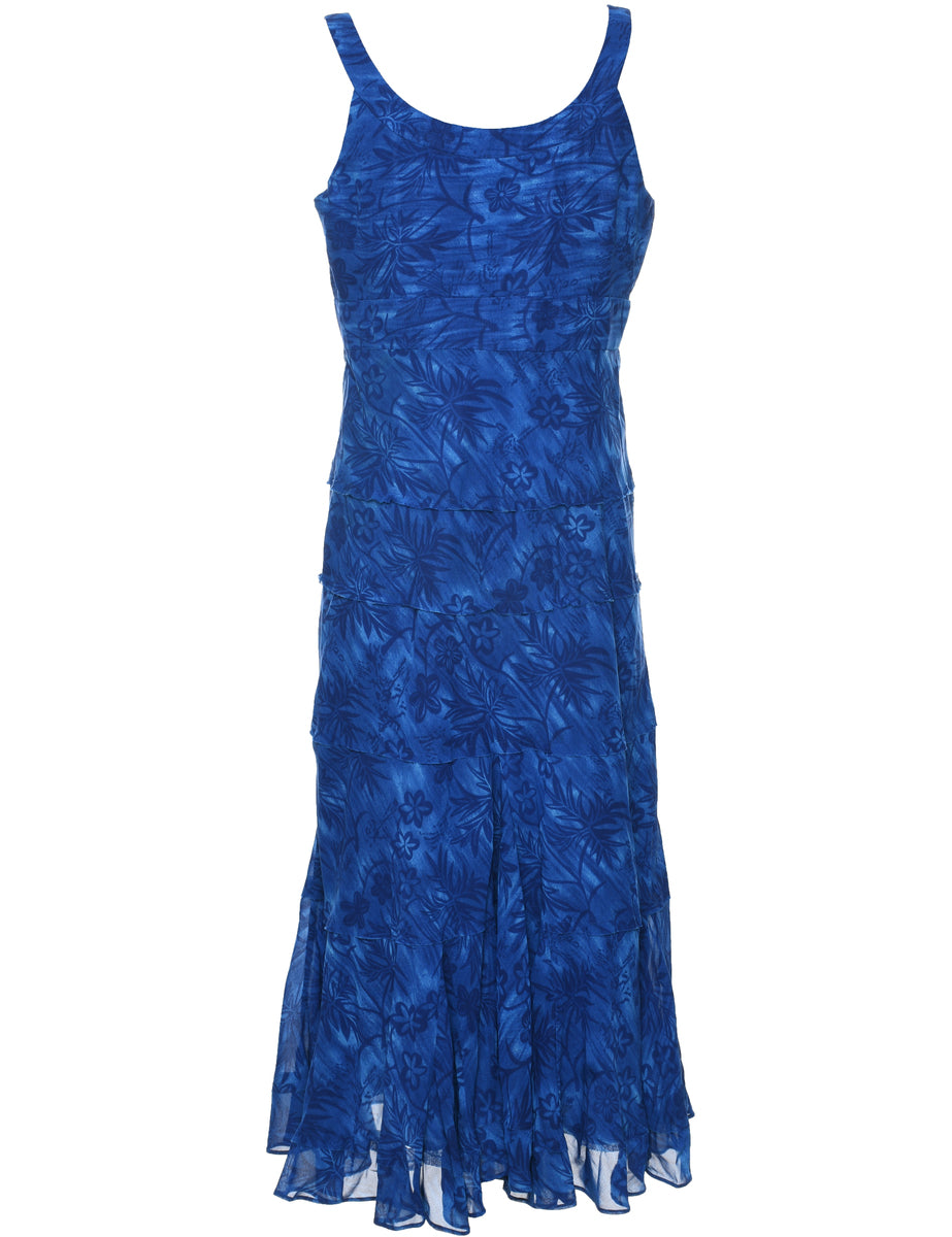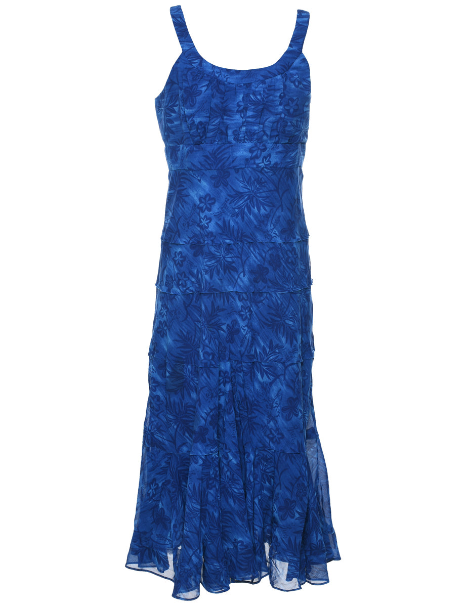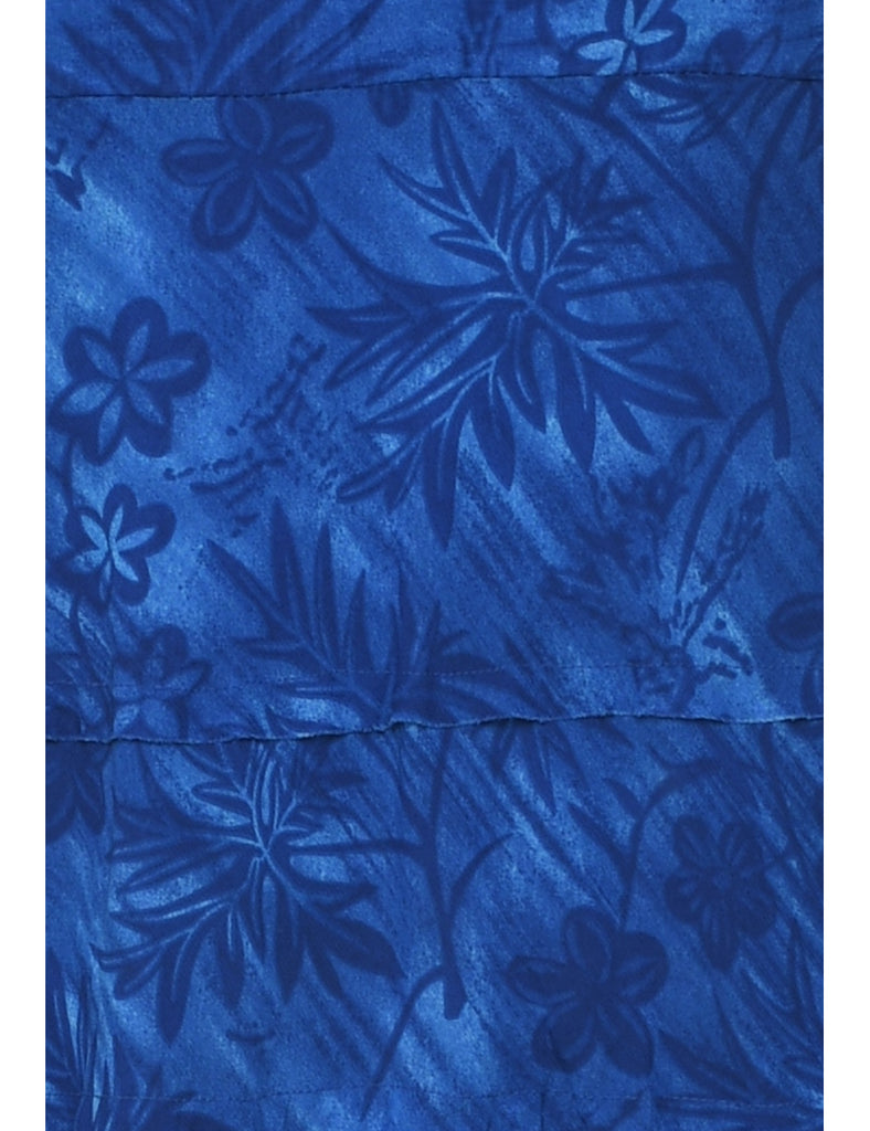 Floral print sleeveless dress comes in blue with ruched detailing.