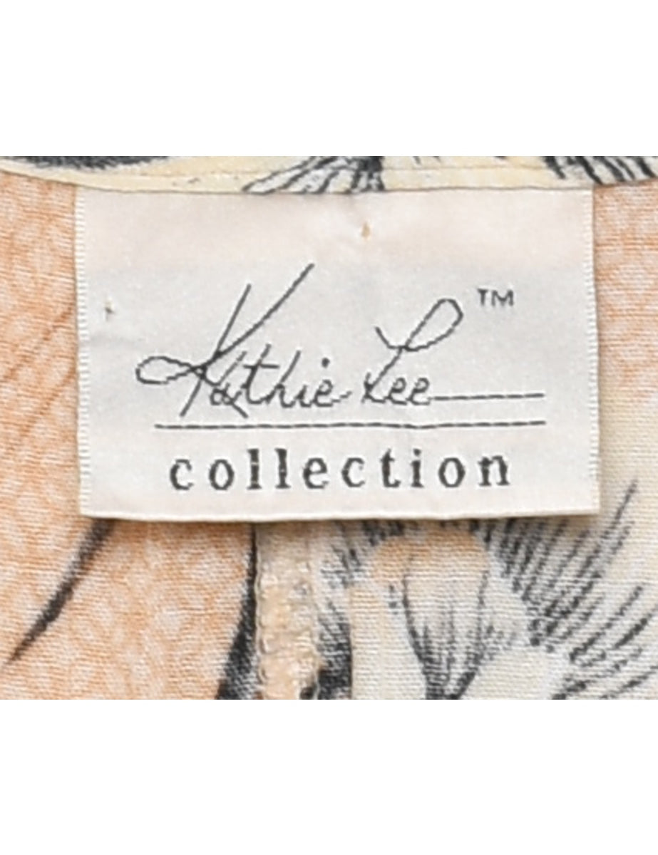 Floral print sleeveless dress comes in beige with a round neck.