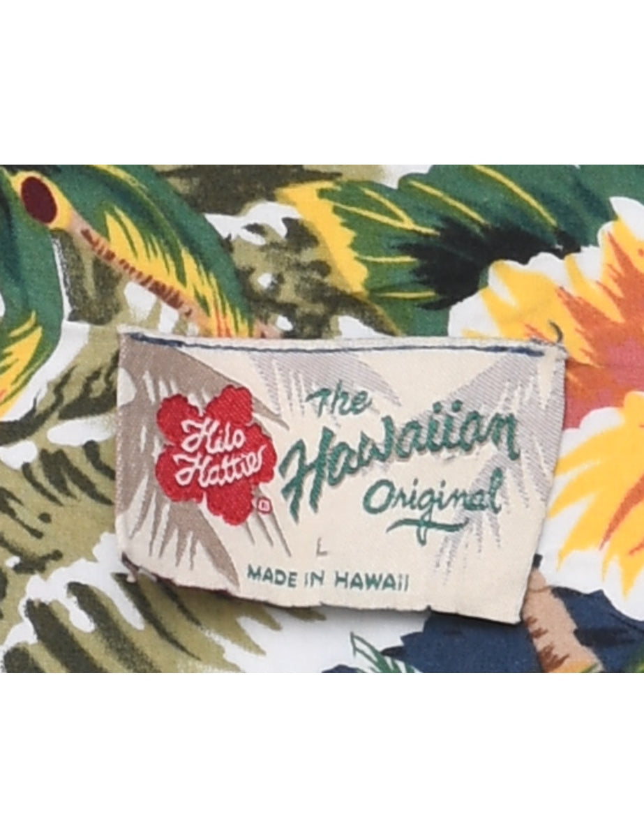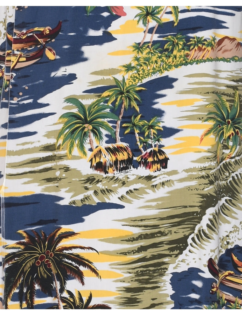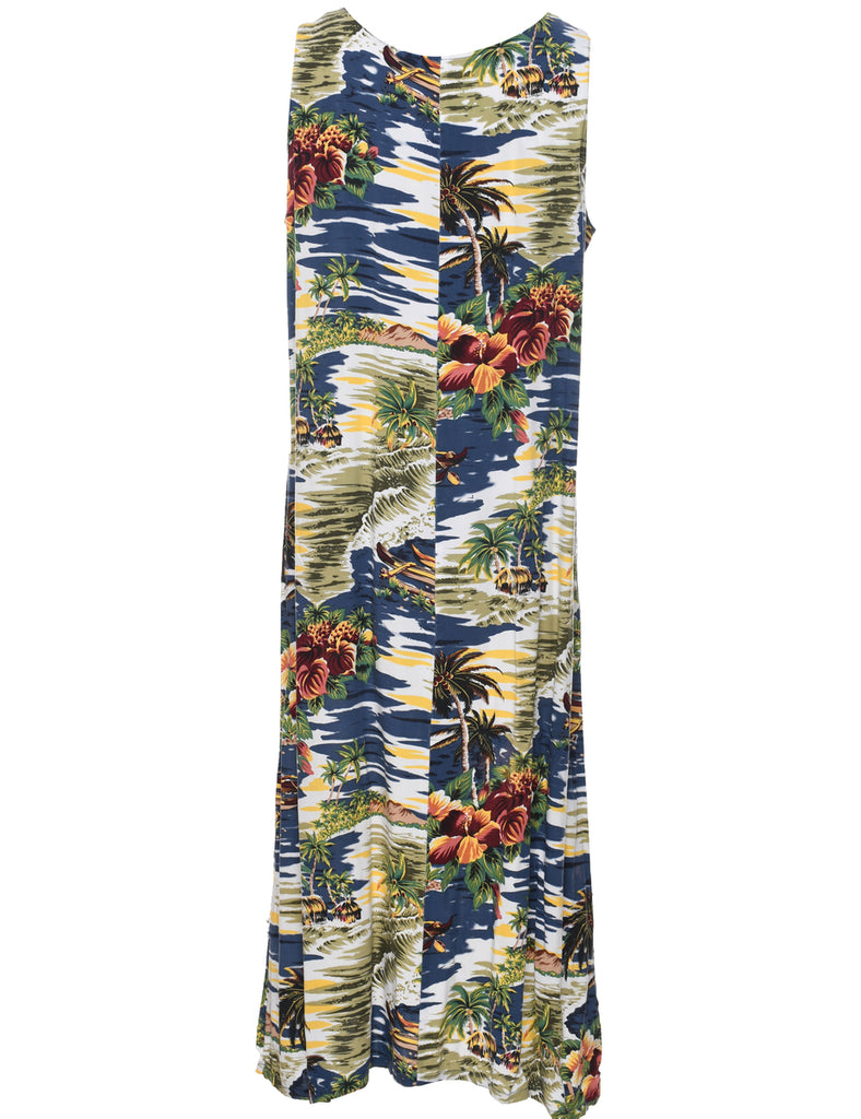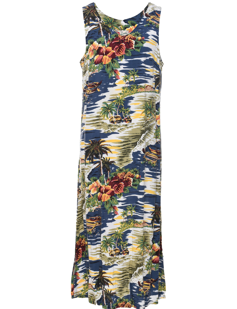 Sleeveless multi-colour dress with hawaiian print, slit and v neck.