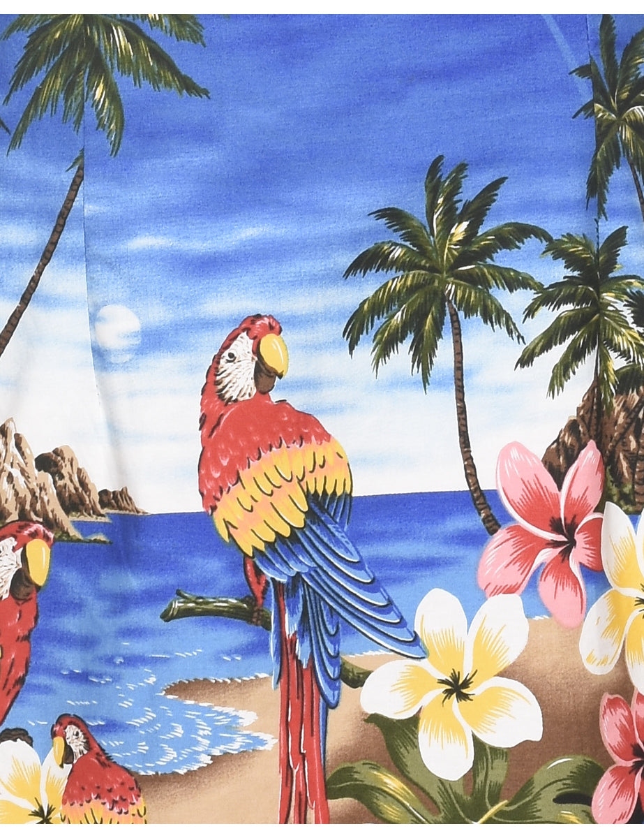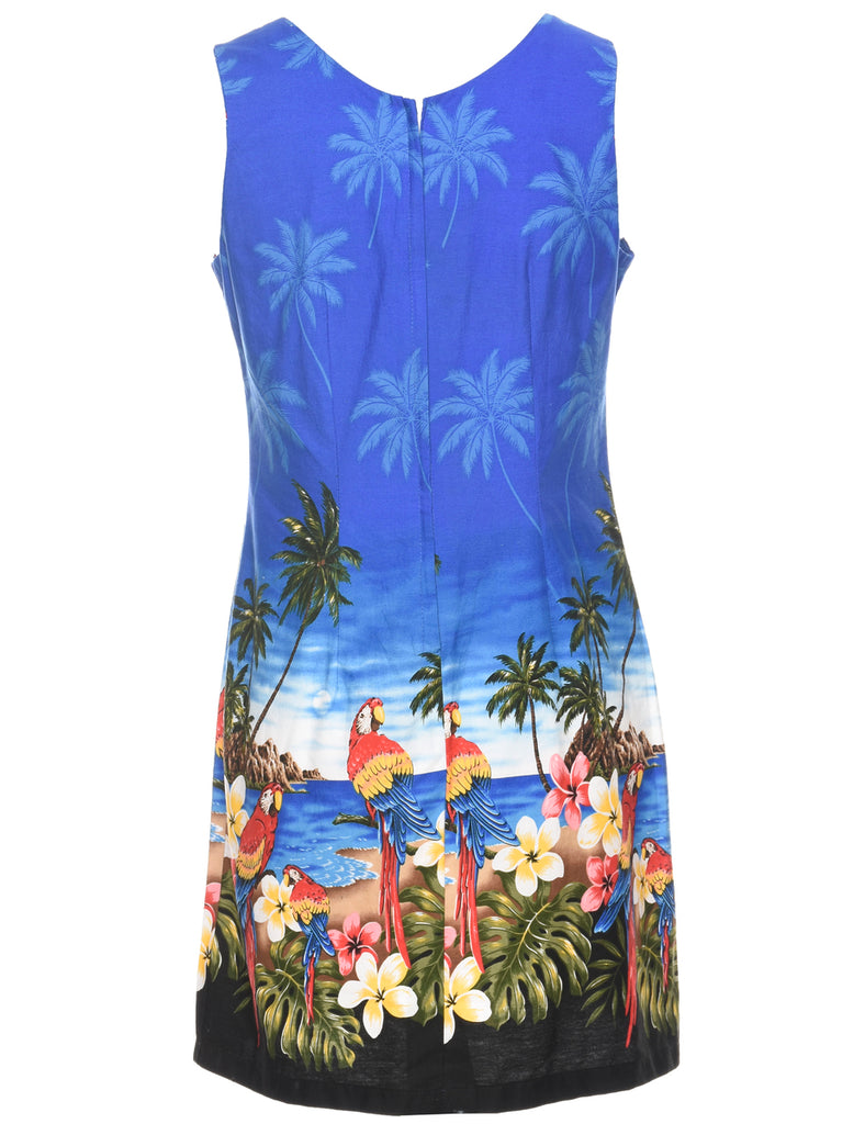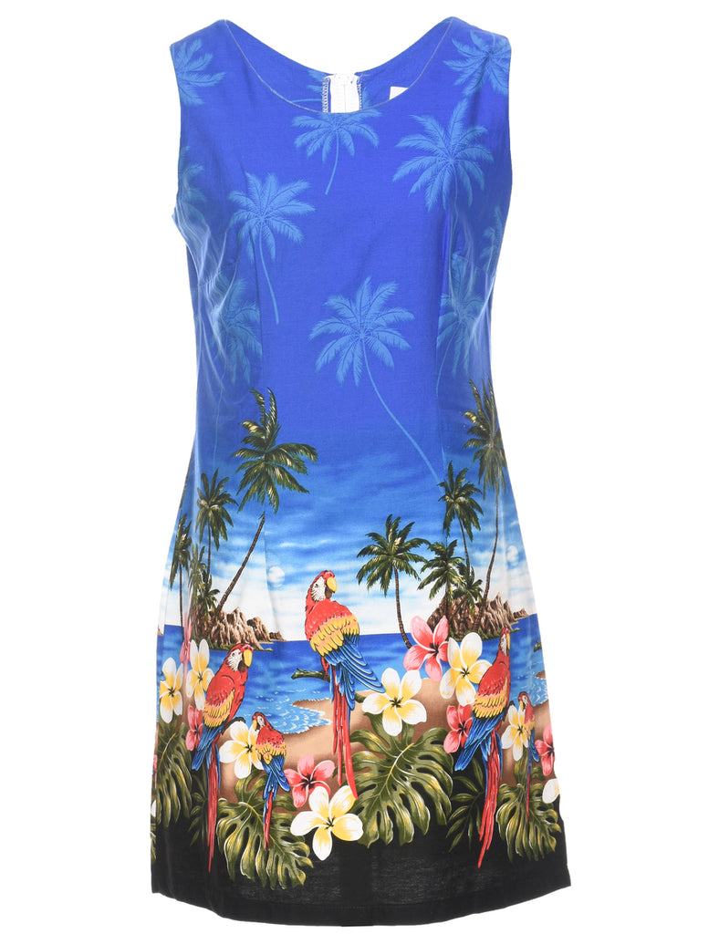 Sleeveless dress with hawaiian print. Comes in black with a round neck.