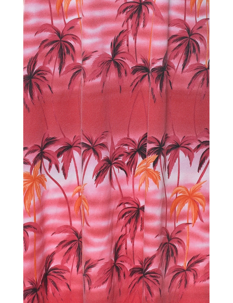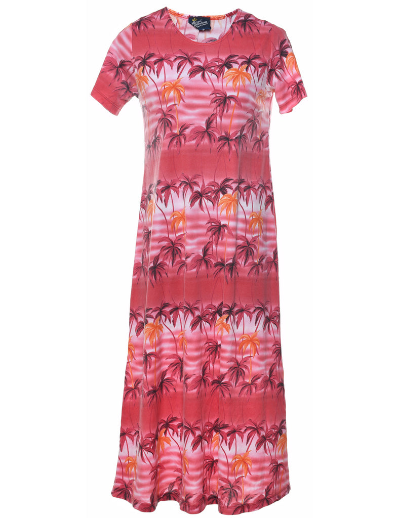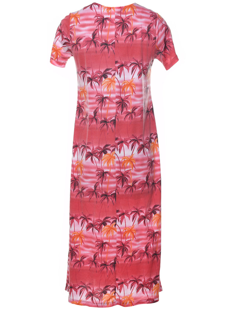 Midi length shift dress in pink with hawaiian print, a round neck.
