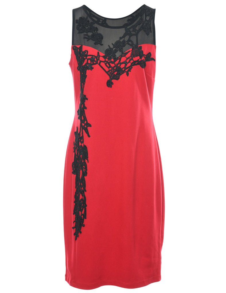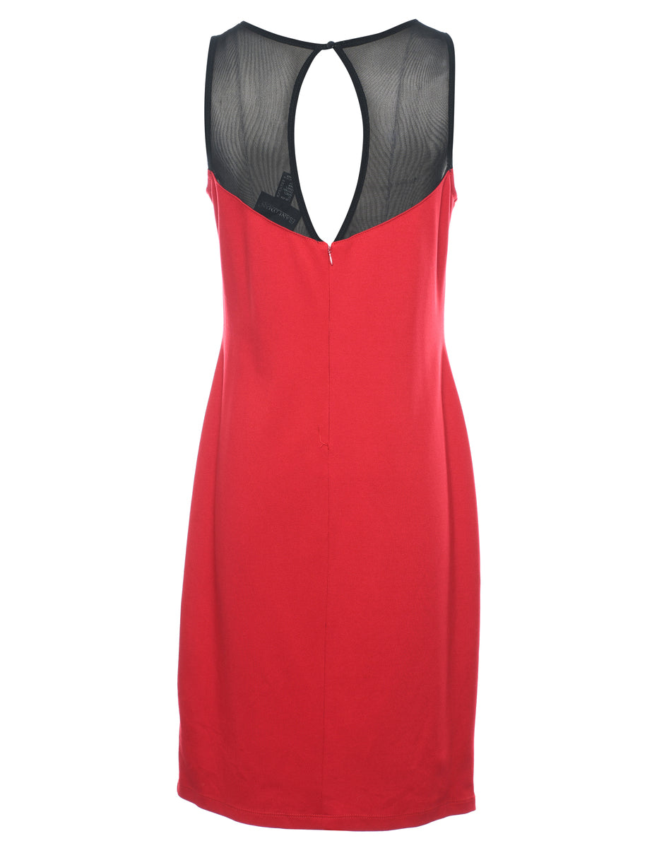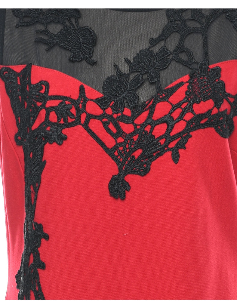 Illusion neckline evening dress in red & black with cut out detailing and contrasting trim.