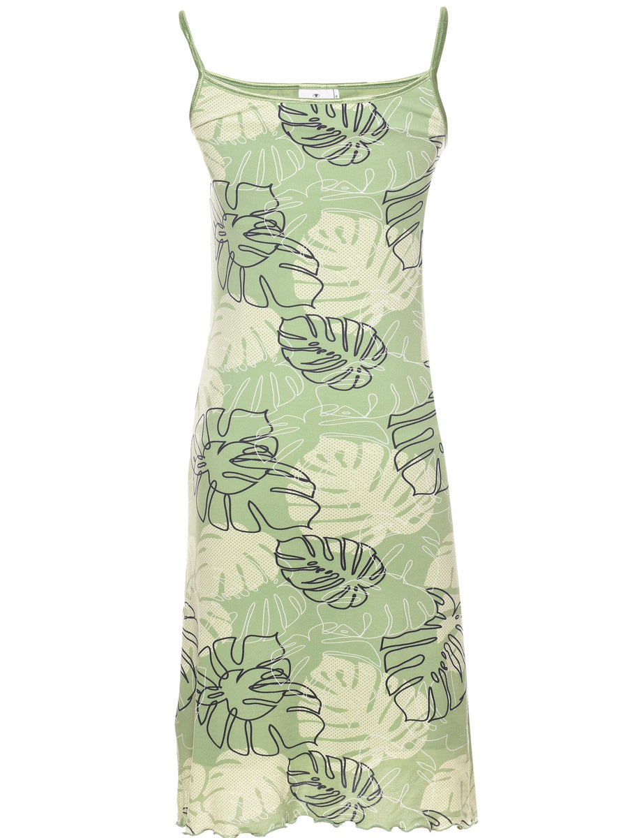 Leafy print strappy dress in green.