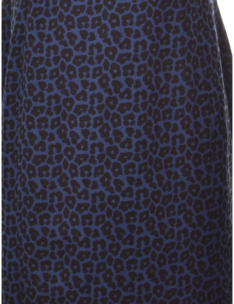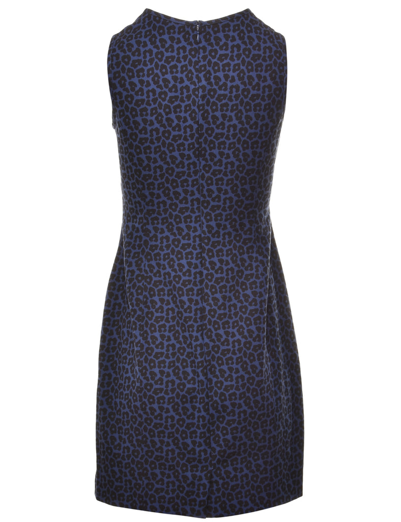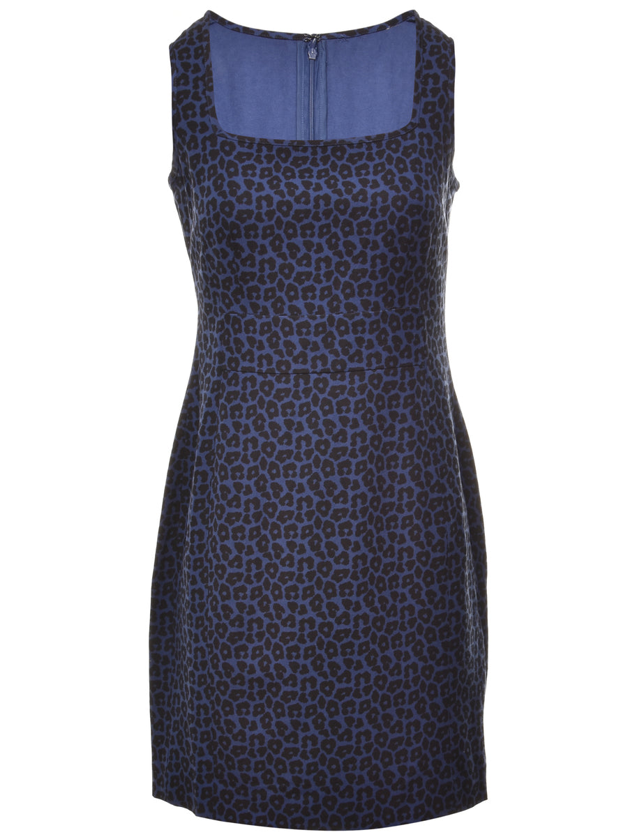 Sleeveless mini dress in navy with leopard print and a square neck.