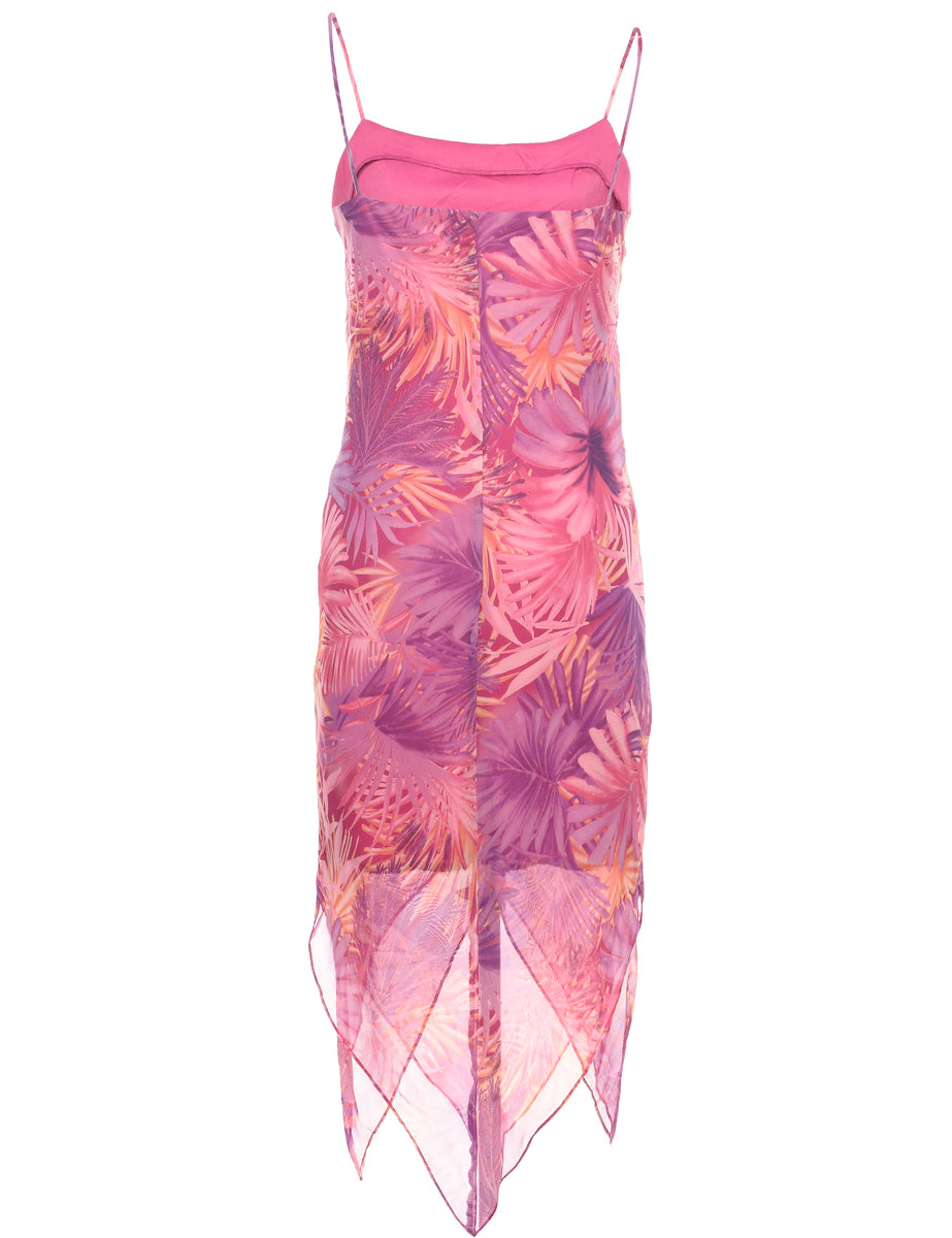 Floral print dress comes in multi-colour with an asymmetric hem.