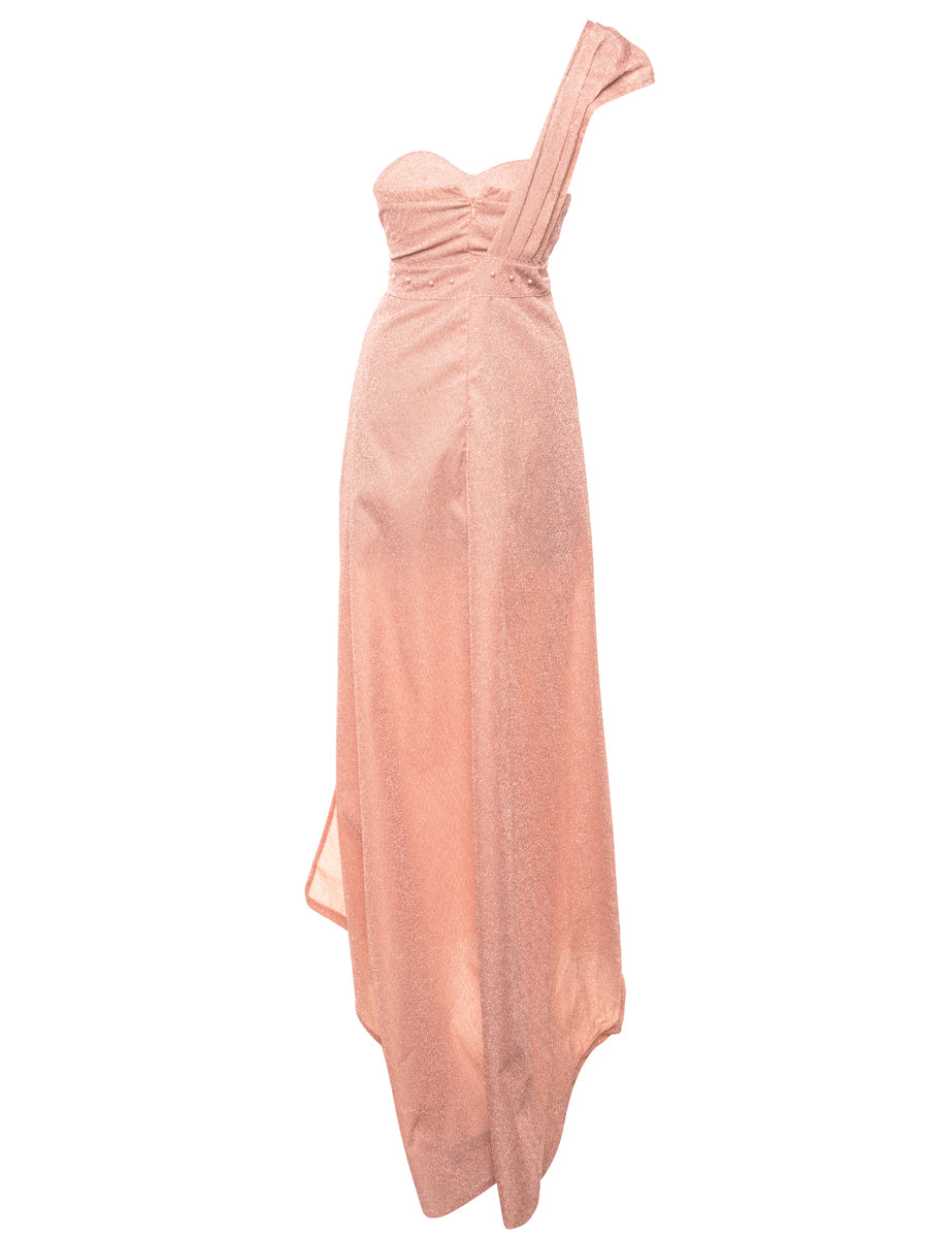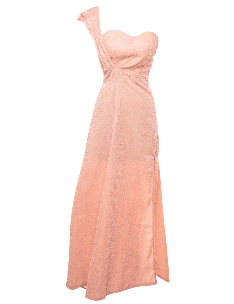One shouldered party dress with metallic pattern. Comes in peach with beading and side slit.